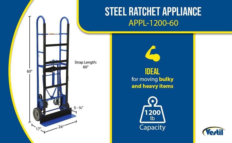 APPL-1200-60 APPL-1200-60Steel Ratchet Appliance Cart 17 In. x 24 In. x 60 In. 1200 Lb. Capacity BlueUniform Capacity (lb.): 1,200