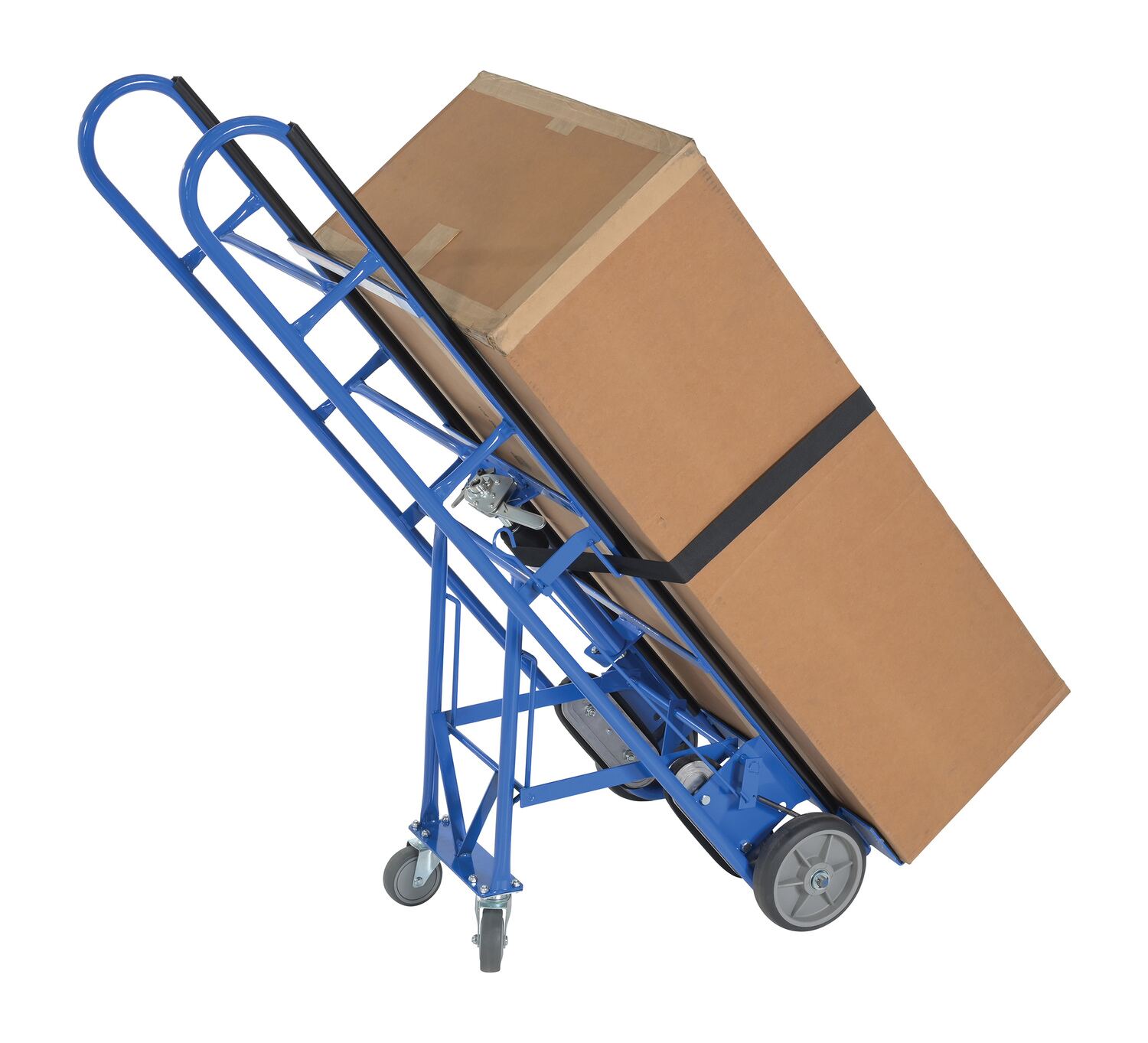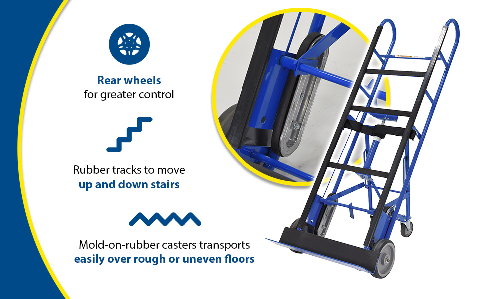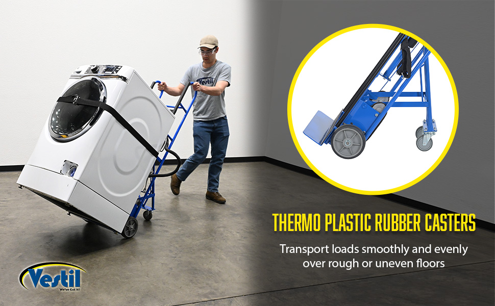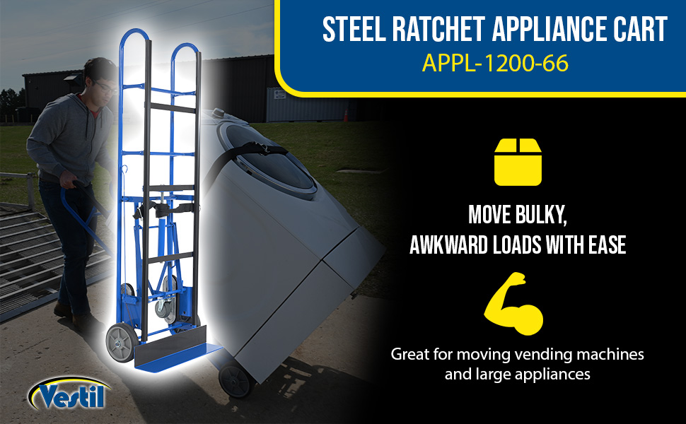 APPL seriesThis cart is ideal for moving large, bulky, heavy appliances, and awkward loads. A strap and tension bar are included with this unit to hold the product in place while transporting up or down stairways, hills, or uneven surfaces. Strap length is 60" for the APPL-500 and APPL-750-B. The 1,200 lb. capacity models include (2) 4" x 1" thermos plastic rubber swivel rear casters, as well as strap retracts. The strap rectracts (from ratchet center) 80" on one side/81" on the other. Robust design can move and maneuver heavy loads like vending machines throughout workplace with ease.