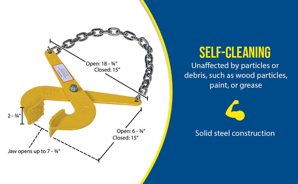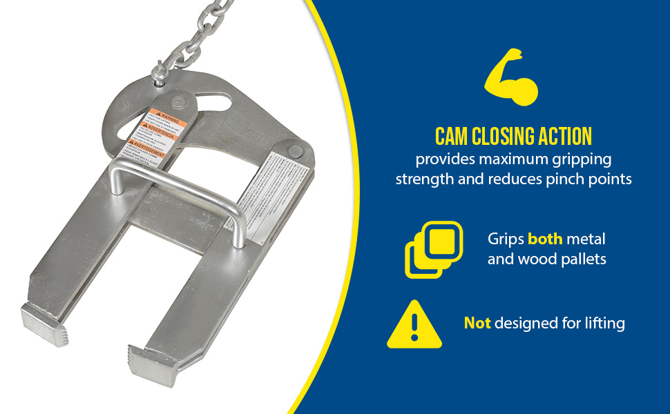 PAL-14 - Cam closing action provides maximum gripping strength and reduces pinch points. Safety handle enables easier positioning and removal. Grips both metal and wood pallets with biting action.