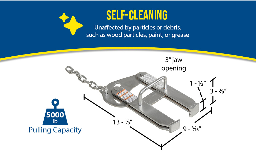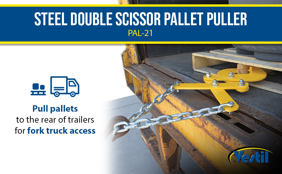Pallet pullers are used to pull pallets from the rear of trailers, to the front, for easy fork truck access. Rugged steel construction. Heads are self-cleaning and unaffected by wood particles, paint or grease. Pallet pullers and chains are NOT designed for lifting.