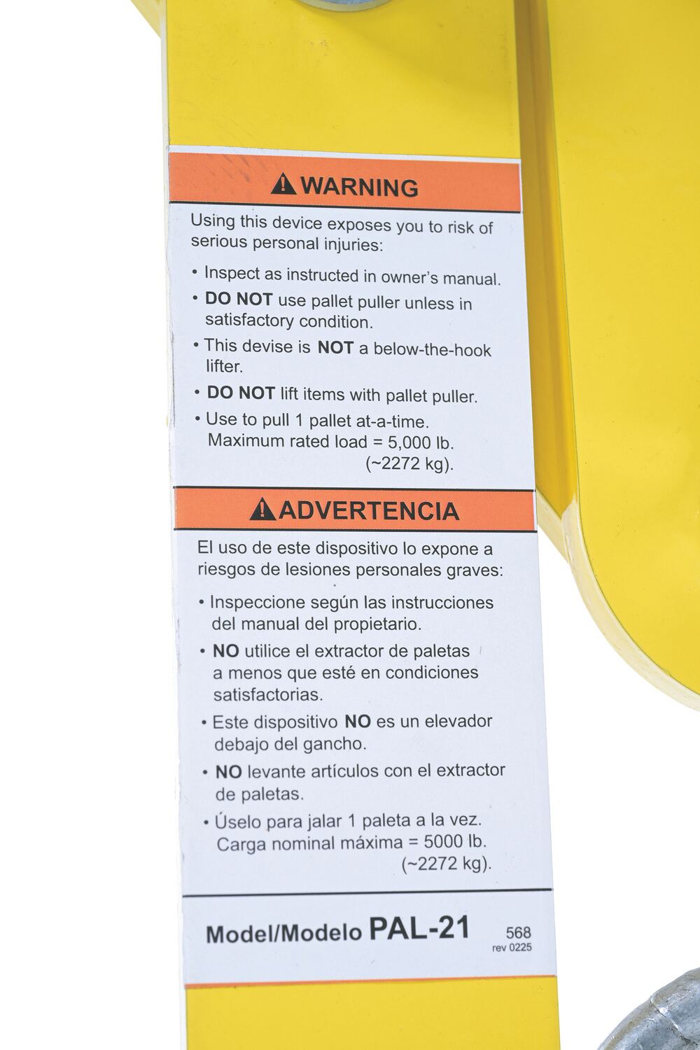 PAL-21 PAL-21Steel Double Scissor Pallet Puller 4 In. Jaw Opening 5000 Lb. Pulling Capacity YellowUniform Pulling Capacity (lb.): 5000