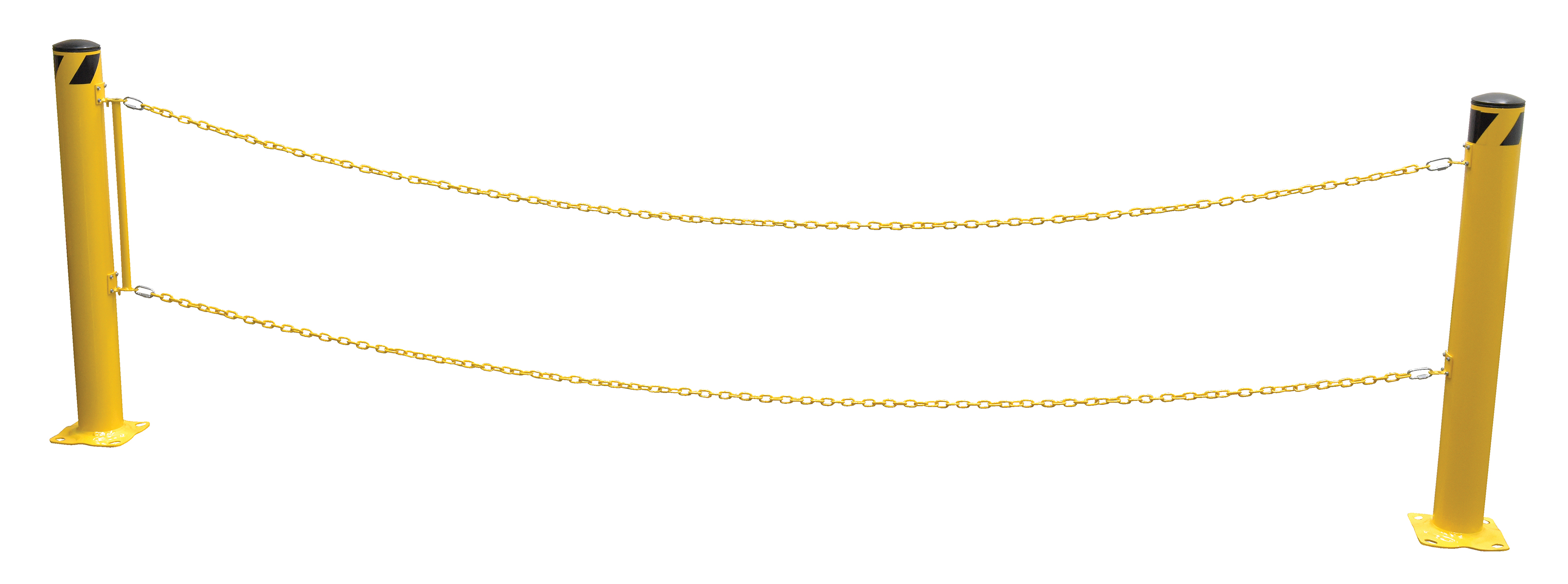 The Dock Chain Bollard Barrier Systems are safety yellow visual barriers that consist of 2 bollards and two chains that span up to 10'. Mounting brackets fasten to each bollard to provide attachment points for the chains. Chain attachments to the bollards are 21" and 41" above the floor. Chain length is customizable upon request.