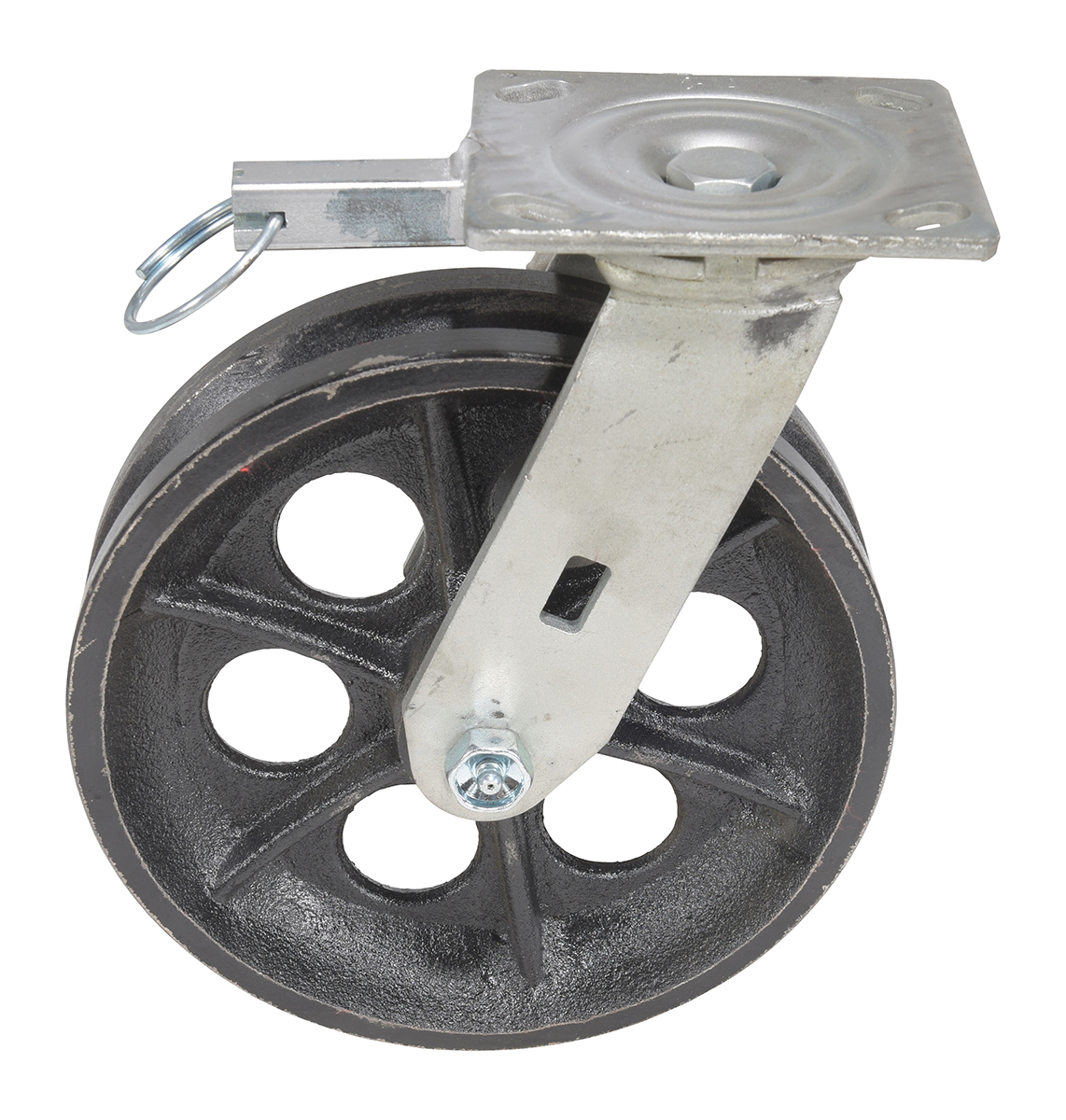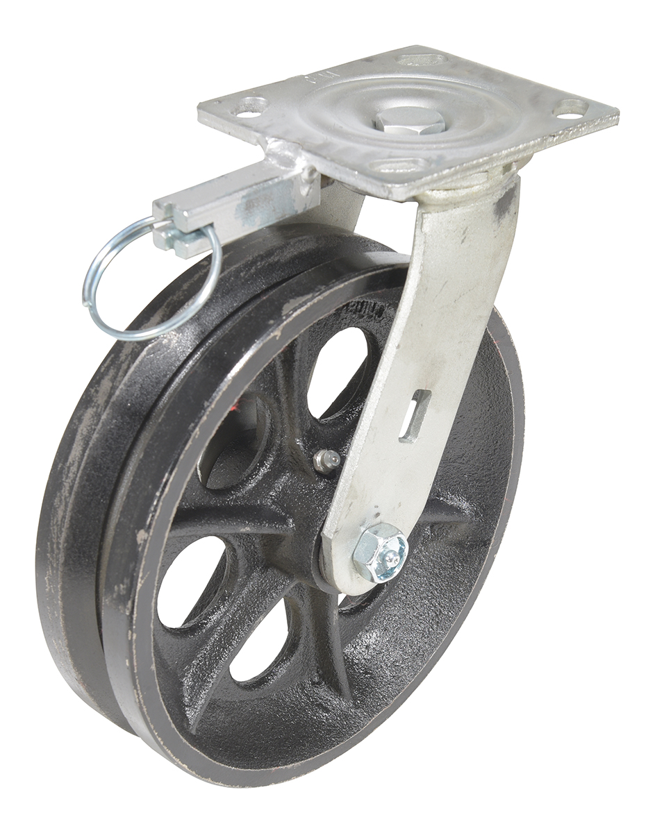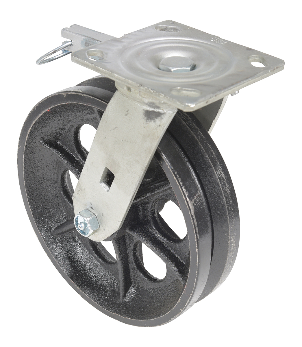 Industrial Ductile Steel V-Groove caster. The V-Groove keeps the caster aligned on a track.