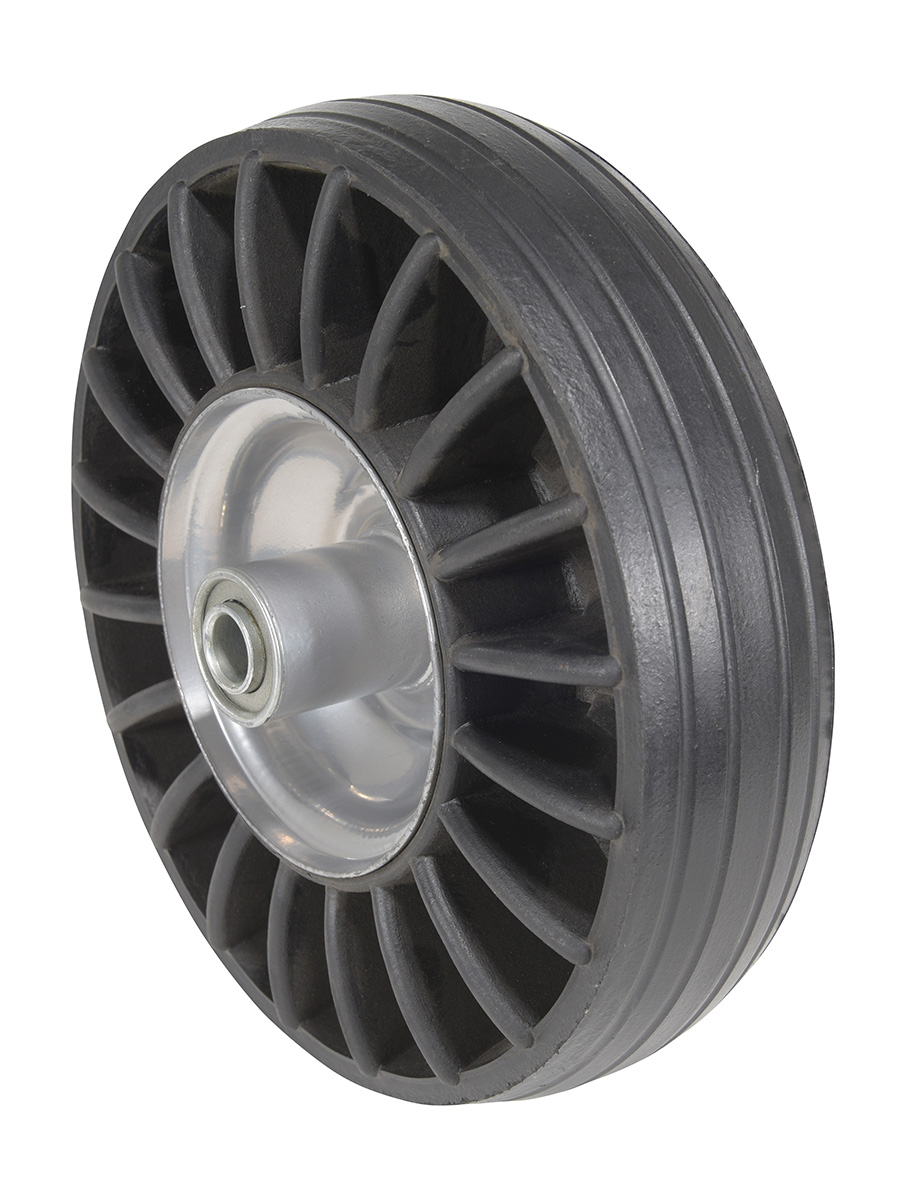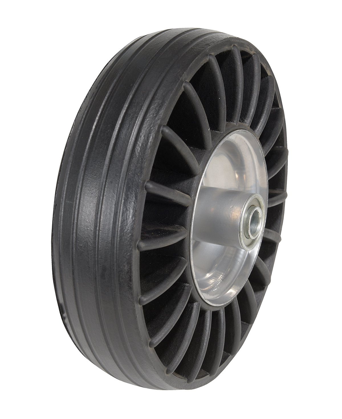 The special design for shock absorption properties prevents wheels from bouncing like standard pneumatic wheels. Ideal for transporting loads down stairs. Solid black molded rubber tread will never go flat. Steel hubs for maximum strength. Precision bearings with 5/8" inside diameter.