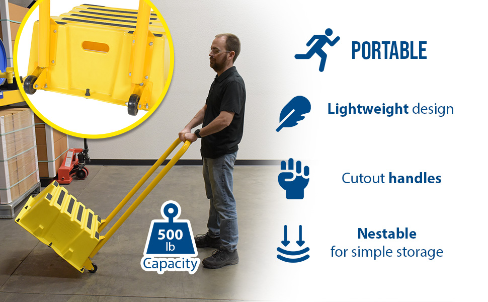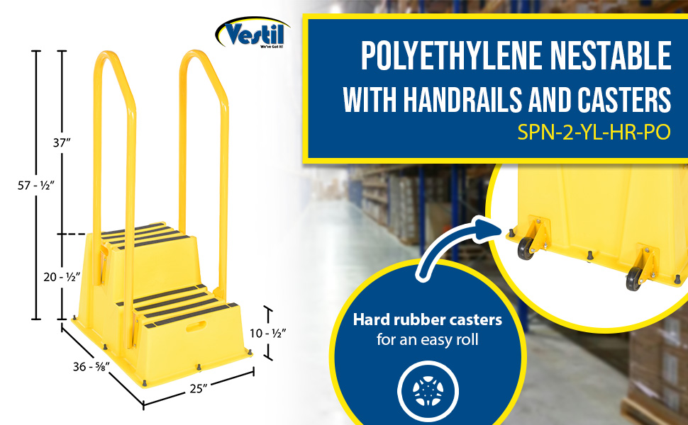 SPN-2-YL-HR-PO SPN-2-YL-HR-POPolyethylene Nestable with Handrails Casters 2 Step 500 Lb. Capacity YellowUniform Capacity (lb.): 500