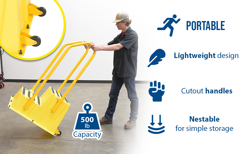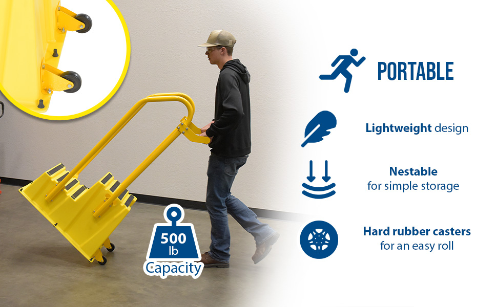 SPN-3-YL-HR-BR-PO SPN-3-YL-HR-BR-POPolyethylene Nestable with Hand and Back Rails Casters 3 Step 500 Lb. Capacity YellowDuty Rating (lbs): 500