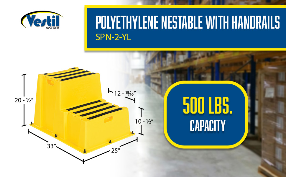 SPN-2-YL-HR SPN-2-YL-HRPolyethylene Nestable with Handrails 2 Step 500 Lb. Capacity YellowUniform Capacity (lb.): 500