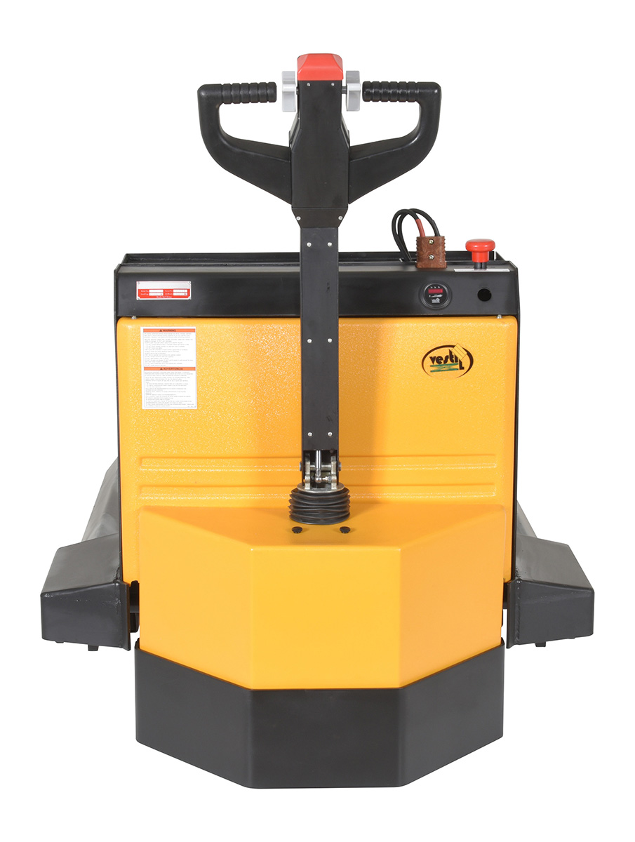 The Electric Powered Roll Pallet Trucks have an easy and quick operation. The unit raises and lowers loads with a push of a button. It can maneuver loads in warehouses and trailers. The reinforced welded forks have adjustable tie-rods that provide long service. The high-torque DC drive and lift motors handle heavy-duty jobs. The truck rolls smoothly on poly-on-steel, steer and load wheels. Ergonomic handle features easy to operate throttle with infinite adjustment of forward and reverse speeds, lift/lower controls, proprietary safety-enhancing emergency reverse function, and horn. When the Proprietary Safety-enhancing Emergency Reverse function is actuated, the emergency reverse belly switch instantly reverses direction and moves the unit forward (away from the operator) until the switch is released or after 1.5 seconds have elapsed. The built-in safety circuit will automatically disable the entire unit if the emergency reverse belly switch is activated for more than 1.5 seconds after which the unit must be re-set to return to normal operating conditions. This state-of-the-art safety device provides a high degree of operator protection. Includes an electromagnetic disc brake with automatic dead-man feature that activates when the user releases the handle. Fully-powered roll truck makes movement of rolls quick and easy. Includes fingertip RAISE and LOWER buttons for operator convenience. Safety belly reverse button improves worker safety. Easy-to-operate throttle for forward and reverse direction