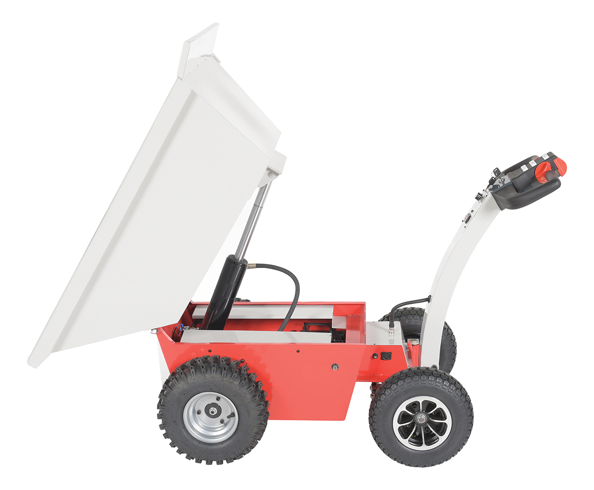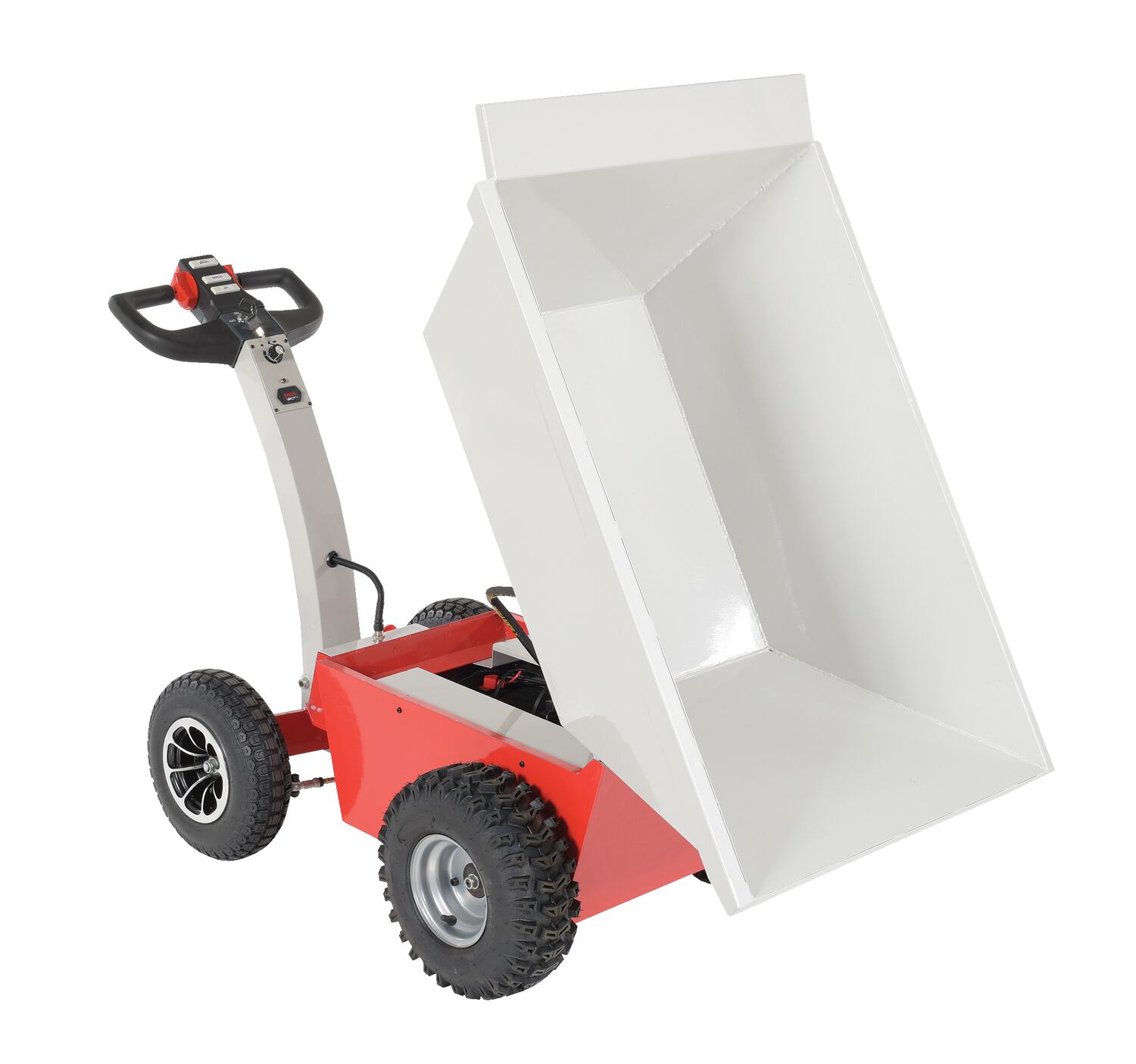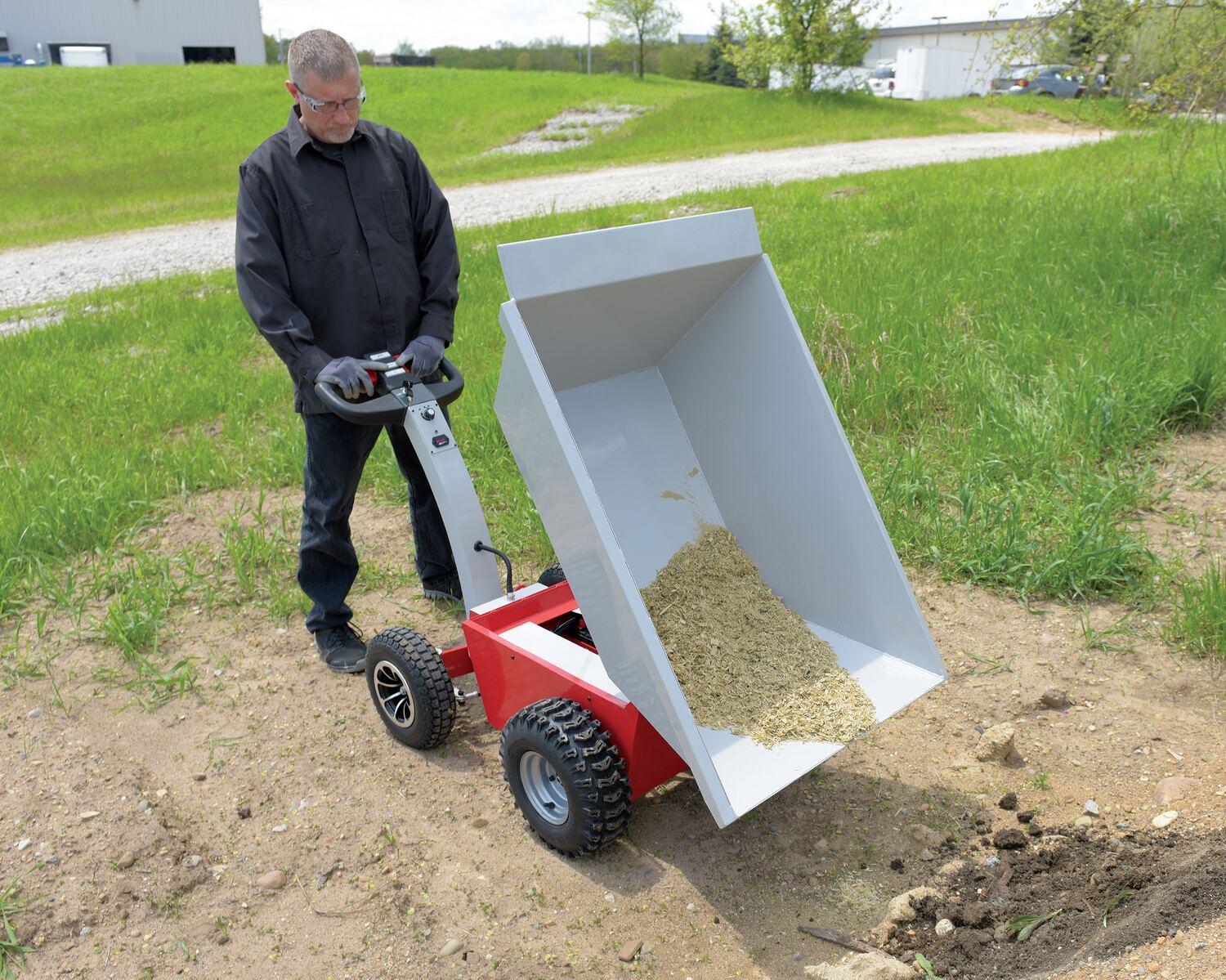 Long laborious work is made easy with a Powered Dump Cart. A large capacity, by weight and cubic feet, allows for the cart to be utilized in both heavy and light working conditions. Hand operated controls gives the user the ability for precise positioning. Included pneumatic wheels are great for traversing a variety of surfaces.