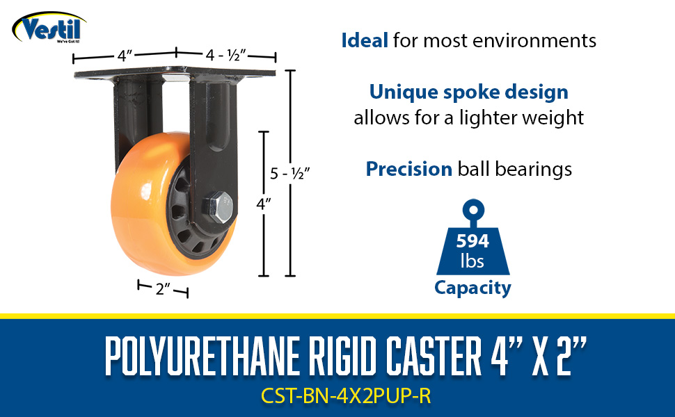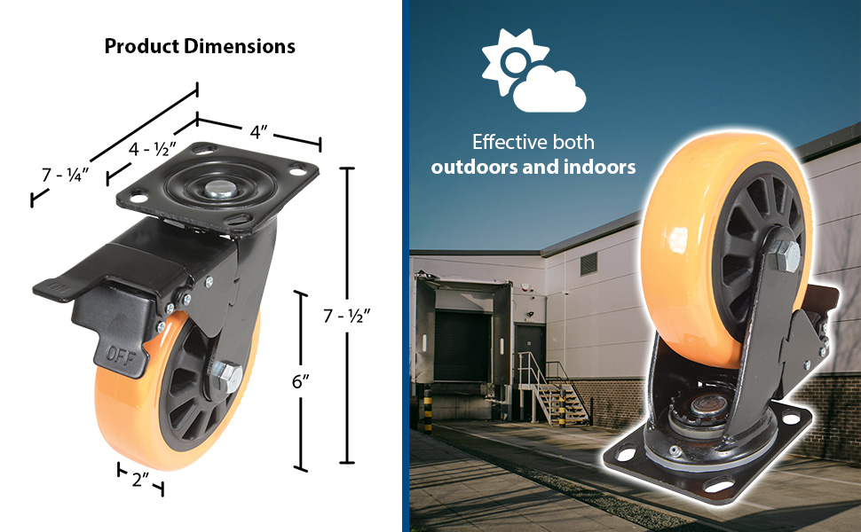 Polyurethane is ideal for most environments. It is resistant to a variety of chemicals, and produces an easy roll for ergonomic applications. It also provides good floor preservation and works effectively in both indoor and outdoor environments. The unique spoke design allows for a lighter weight caster with the same amount of capacity.