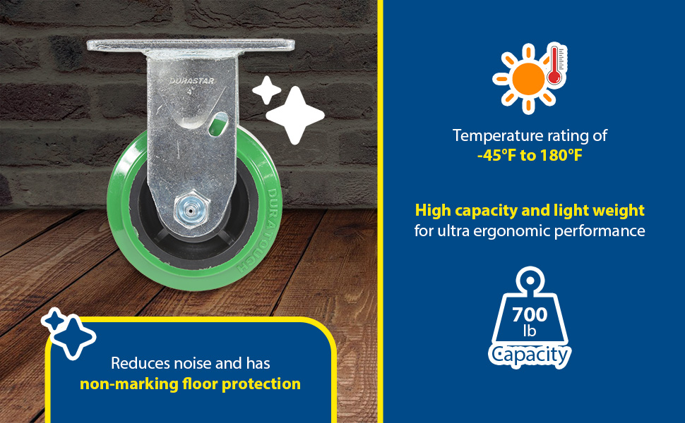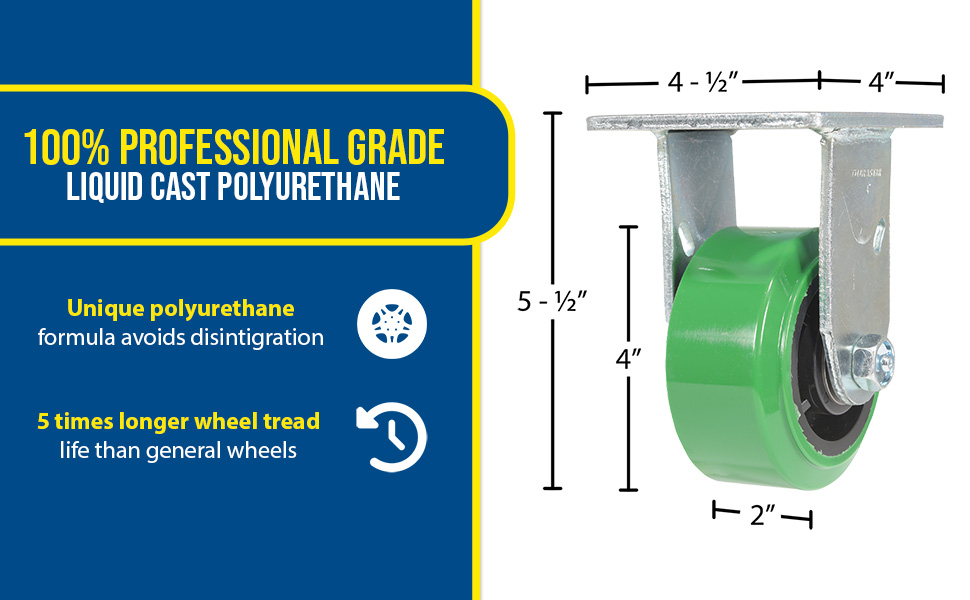 Made with 100% pure polyurethane tread. This caster is a great upgrade for standard polyurethane. Designed using a new liquid cast flow fusion that ensures a 100% mechanical bond to core and "zero" trapped air. It has a high resistance to debris and most chemicals. The proprietary tread provides good floor preservation, and has a longer life performance than standard polyurethanes. Green tread color. 90-95 shore a. Wheel center is constructed of polyolefin.