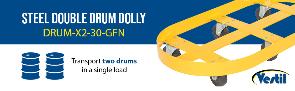 DRUM-X2-30-GFN DRUM-X2-30-GFNSteel Double Drum Dolly with Glass Filled Nylon Casters 45 In. x 45 In. x 39 In. Two 30 Gallon 2000 Lb. Capacity YellowNet Capacity (lbs): 2000