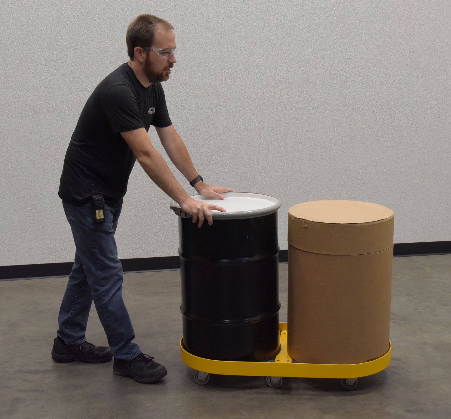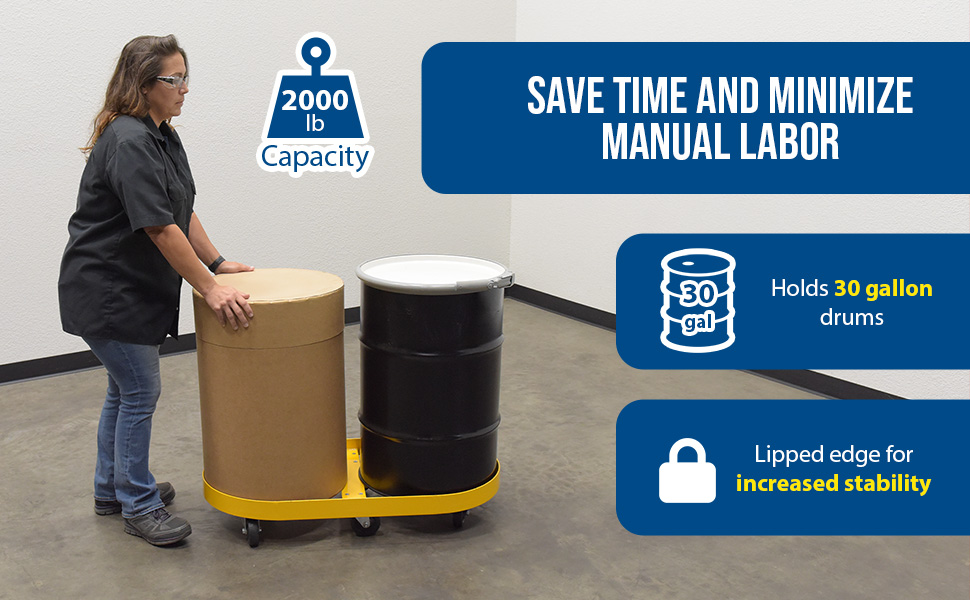 DRUM-X2-30-HR DRUM-X2-30-HRSteel Double Drum Dolly with Hard Rubber Casters 45 In. x 45 In. x 39 In. Two 30 Gallon 2000 Lb. Capacity YellowNet Capacity (lbs): 2000