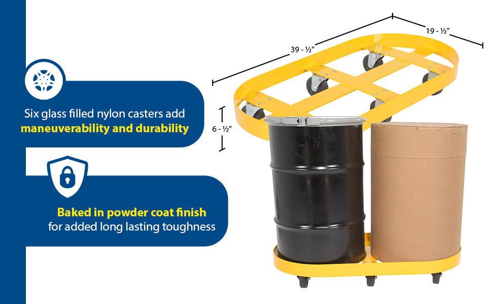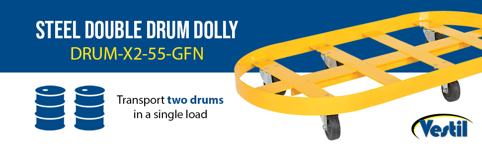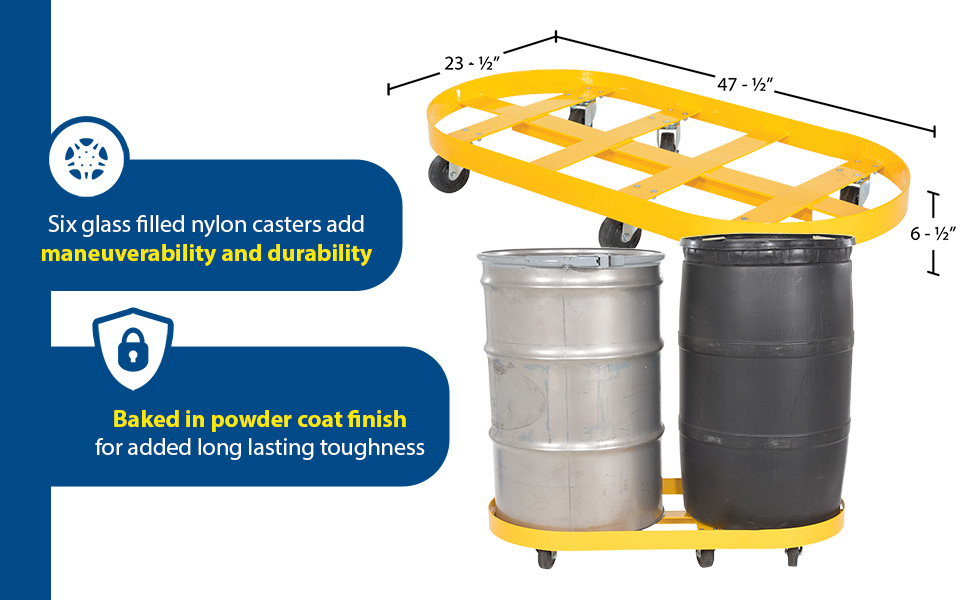 DRUM-X2-55-GFN DRUM-X2-55-GFNSteel Double Drum Dolly with Glass Filled Nylon Casters 45 In. x 45 In. x 39 In. Two 55 Gallon 2000 Lb. Capacity YellowNet Capacity (lbs): 2000
