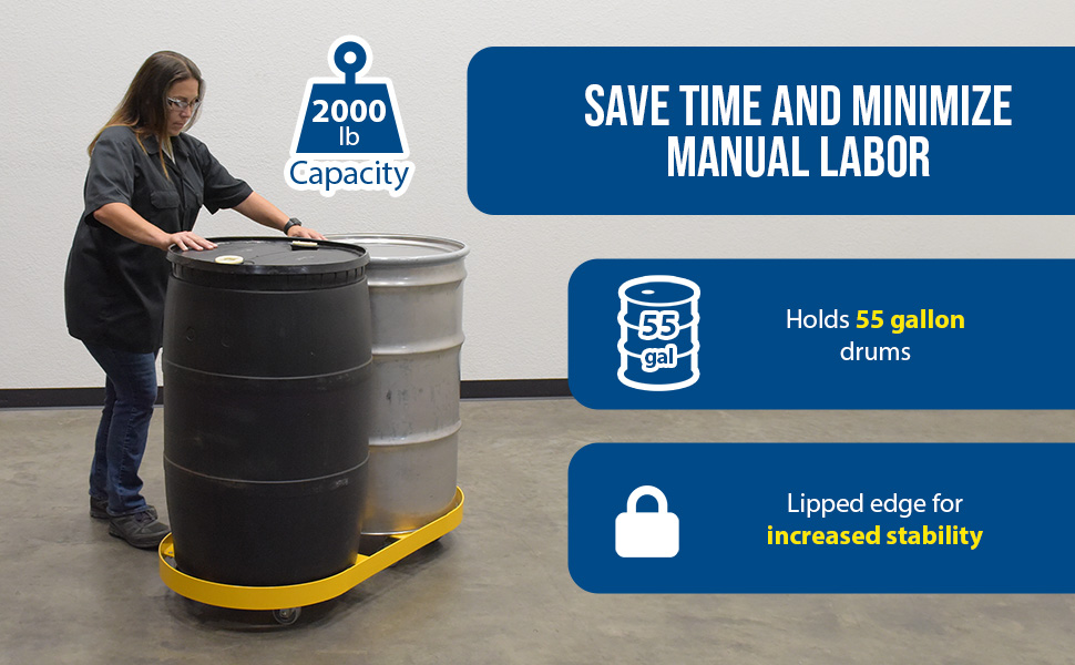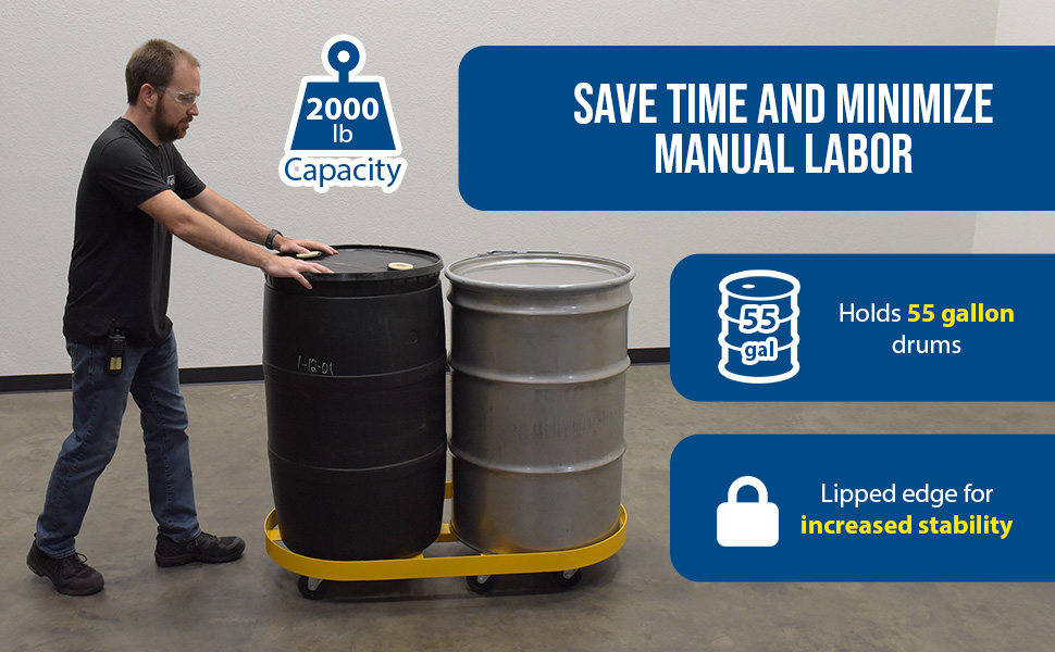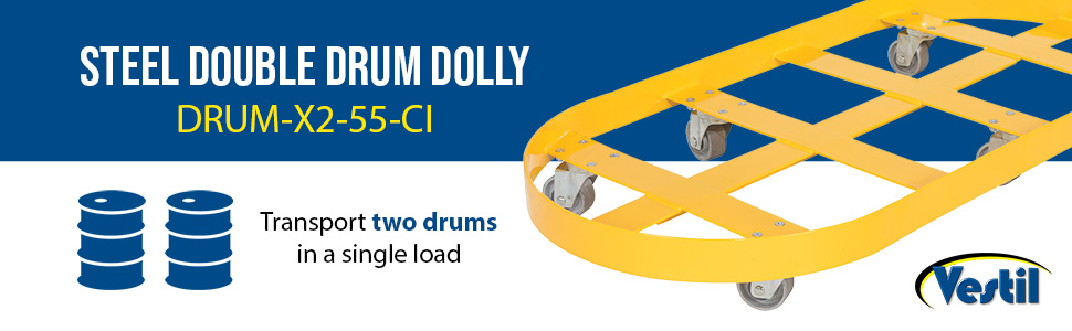 DRUM-X2-55-HR DRUM-X2-55-HRSteel Double Drum Dolly with Hard Rubber Casters 45 In. x 45 In. x 39 In. Two 55 Gallon 2000 Lb. Capacity YellowNet Capacity (lbs): 2000