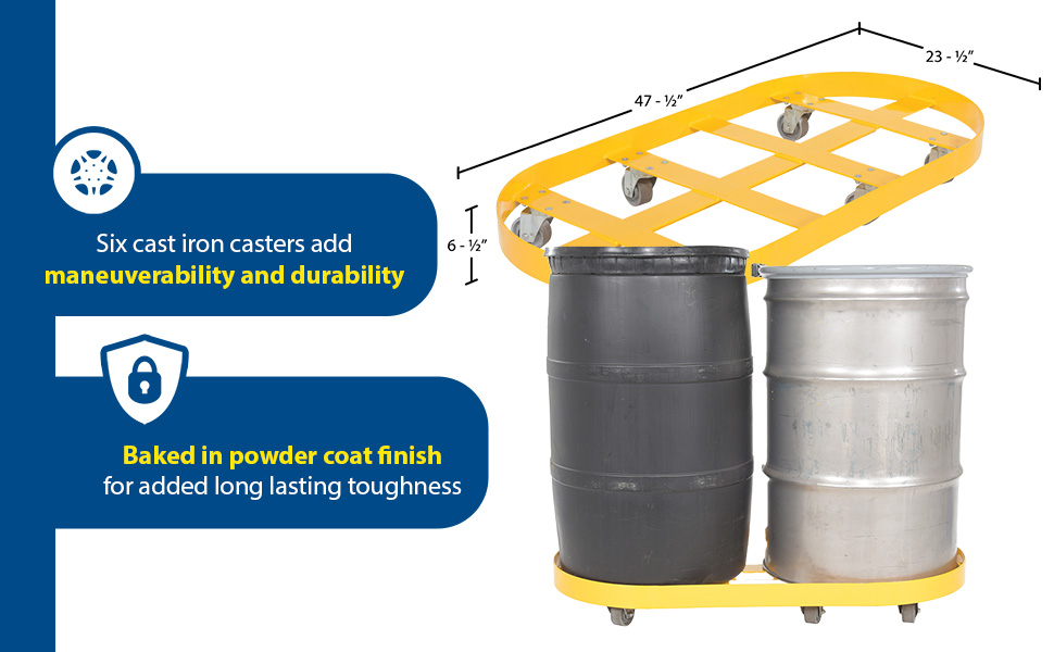 DRUM-X2-55-CI DRUM-X2-55-CISteel Double Drum Dolly with Cast Iron Casters 45 In. x 45 In. x 39 In. Two 55 Gallon 2000 Lb. Capacity YellowNet Capacity (lbs): 2000