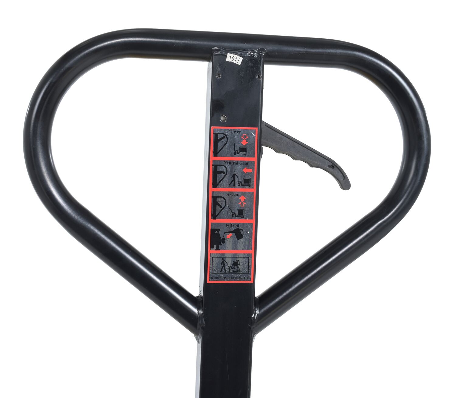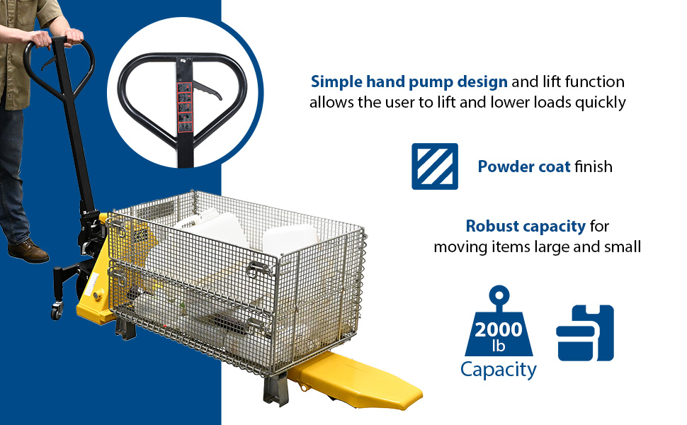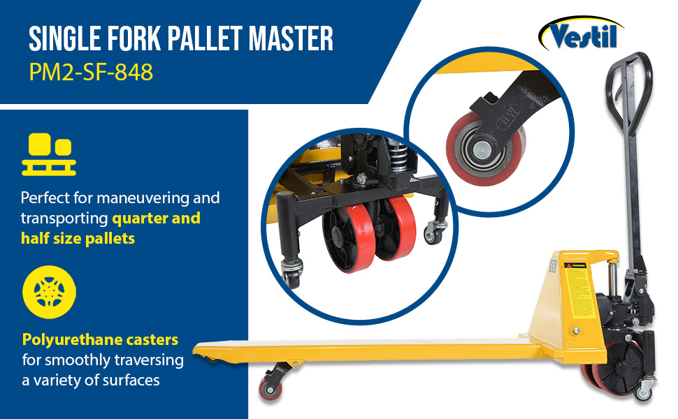 A single fork pallet master is the perfect accessory for maneuvering quarter and half size pallets. The simple hand pump design and lift function allows the user to lift and lower loads quickly. With a sleek powder coat finish baked in to a steel construction, this pallet master has a robust capacity for moving items large and small. The unit rolls on polyurethane casters, great for smoothly traversing a variety of surfaces.