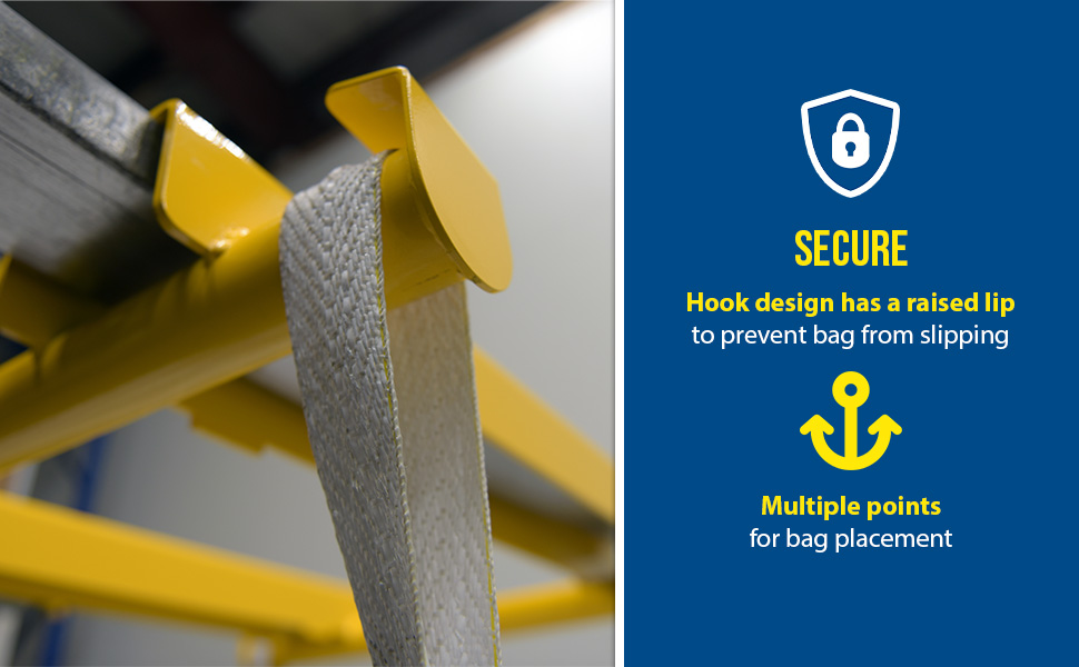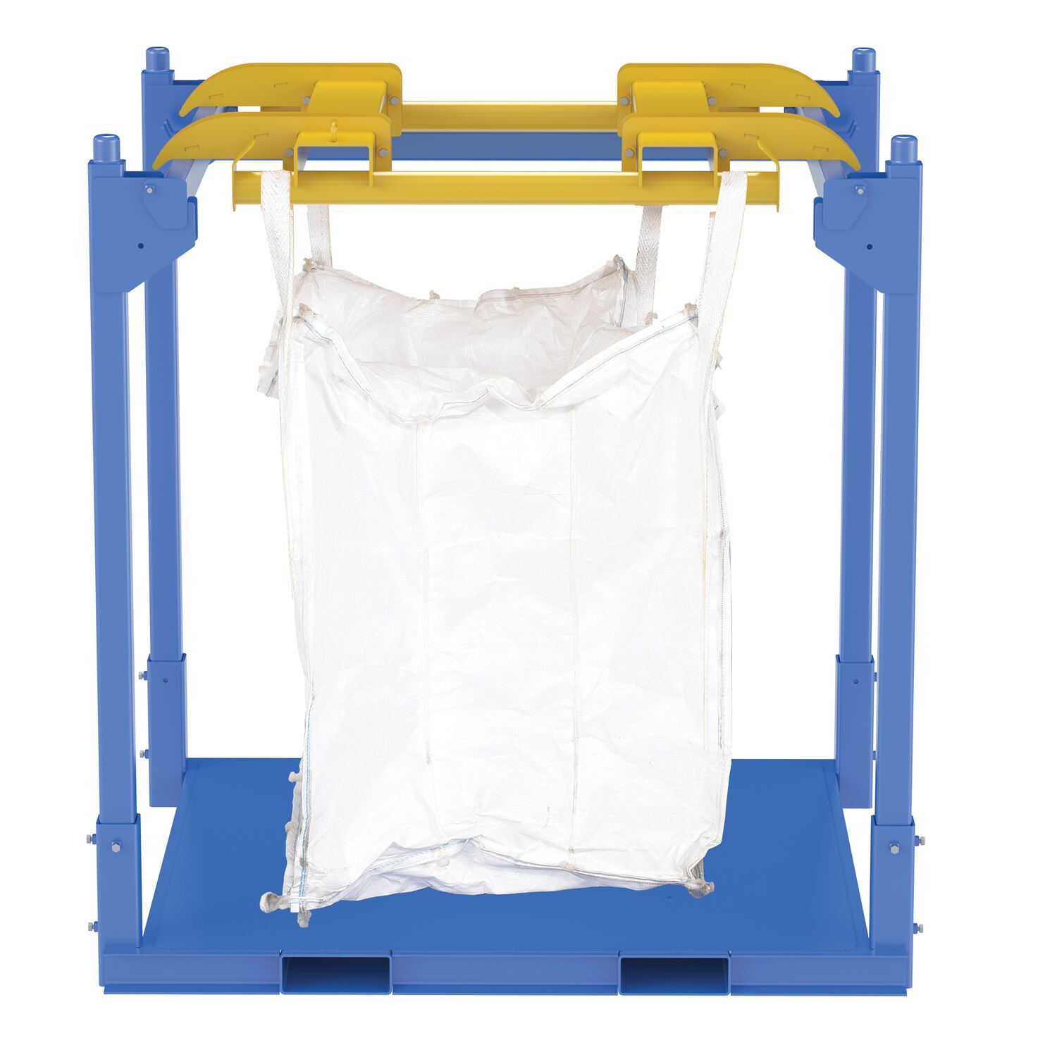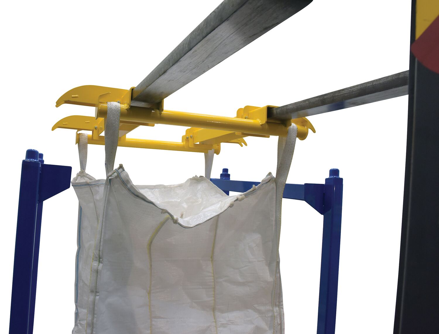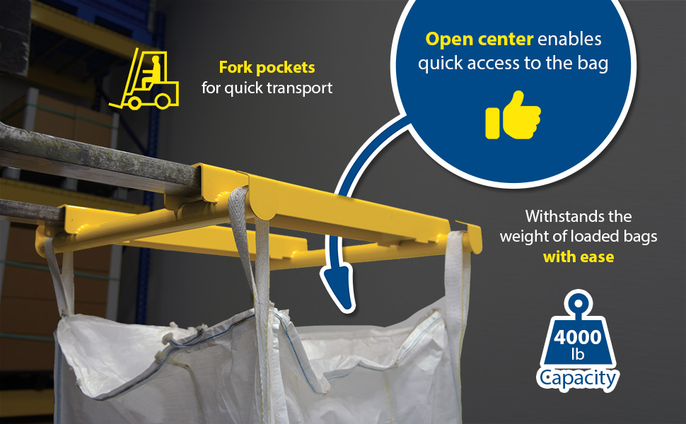 The bulk bag lifter, arms, and rack combination provides the user with an array of choices during the lifting process. The bag lifter with an open center gives the user flexible access to the top of the bag and the goods included. The additional arms provide support by lying across the bars of storage racks, while the included storage rack design is great for quick movement between areas and stacking during times of storage.