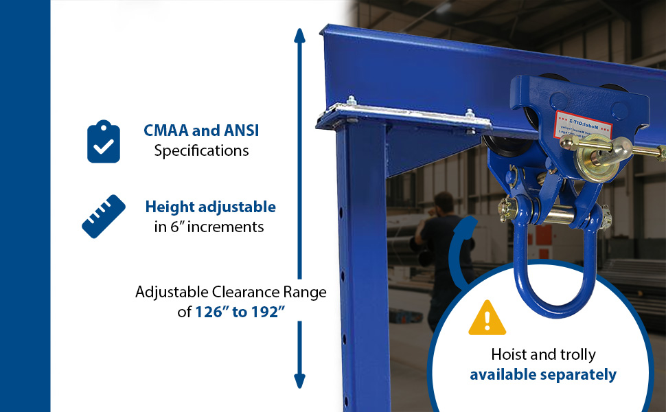 | Steel Knock-Down Adjustable Height Gantry Crane with V-Groove Ductile Steel Casters 10 Ft. Wide x 14 Ft. Max Usable Height 4,000 Lb. Capacity Blue | Uniform Capacity (lb.): 4,000 Adjustable Clearance Range (in.): 102 to 168 | 834 |