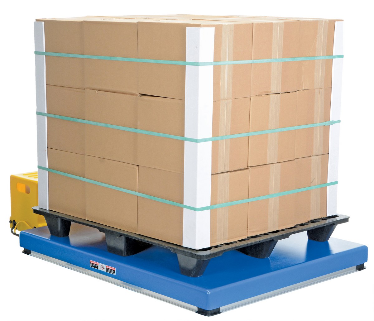 The low profile electric/hydraulic scissor lift table loads and unloads skids with a pallet truck without the need for a pit when using the optional approach ramp. The superior engineering features rugged durability with safety features that include an electric perimeter pinch point guard, emergency stop velocity fuse in cylinders, handheld control and maintenance supports. The remote power unit (32-1/2" x 12" x 12") with 8 foot of hose and cable comes complete with a plastic cover to protect the motor from dust and debris. All standard units are equiped with a 460V, 3-phase power supply.