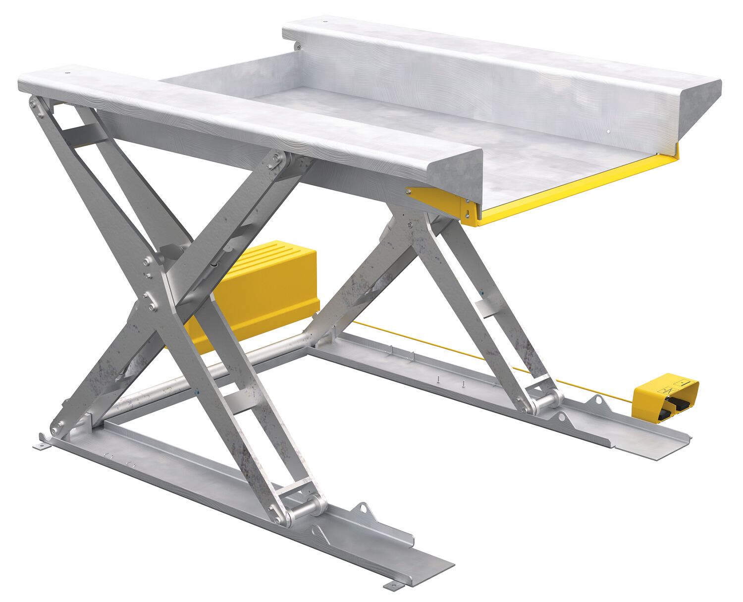EHLTG in useA Ground Lift Scissor Table is a perfect addition to any material handling operation. Products and material can be loaded onto the platform with pallet trucks and raised to an ergonomic working height. An entry-side electric toe guard protects pinch points during lowering of the table. A safety velocity fuse is included to maintain platform height in the event of a hose or fitting failure. The motor is totally enclosed and the partially stainless steel construction provides great protection. The remote power unit can be located up to eight (8) feet away from the table. Optional accordion skirting and a variety of voltages are available.