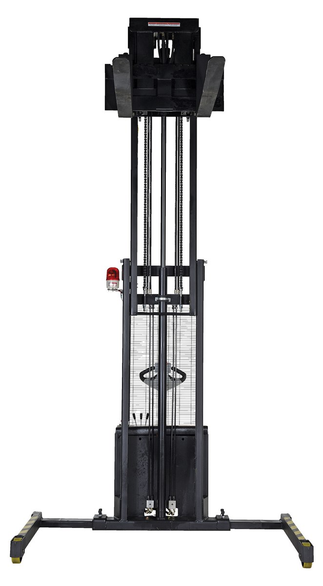 Powered Stacker with Power Drive, Power Lift, and Power Fork Reach is ideal for distribution and shipping facilities. The stacker is equipped with extendable forks, which can be utilized to reach 25" and lift objects in a condensed area where room to maneuver is limited. The stacker is power driven with simple controls that allow for precise positioning of products. Features two (2) 12V batteries with on-board charger. To use, align forks in the desired position and extend the forks to reach the product safely. Once the unit is in place and the product is secured, the stacker can be driven to the preferred workspace.