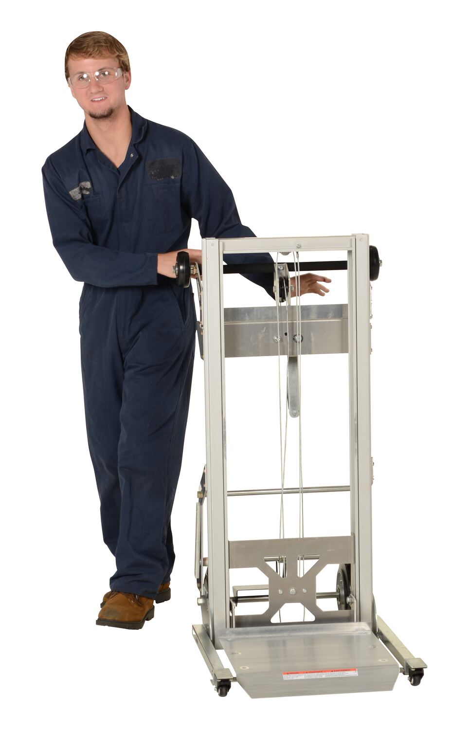 Portable Aluminum Load Lifter is durable, lightweight, and constructed of corrosion resistant aluminum. Ideal in shipping and receiving areas to load and unload pallet racking and to move parts. This unit folds up and down for compact storage and easy transportation. Ultra low profile design with ramp is great for appliance, office, and furniture stores. Features a foot actuated brake. Uniform capacity is 200 lbs.