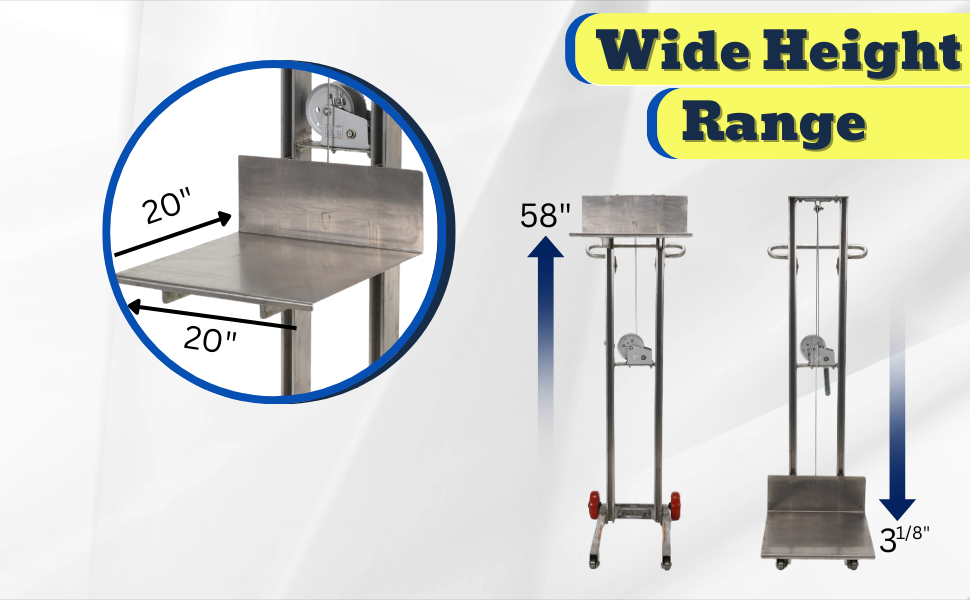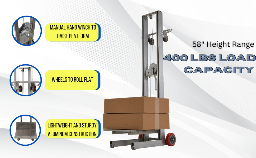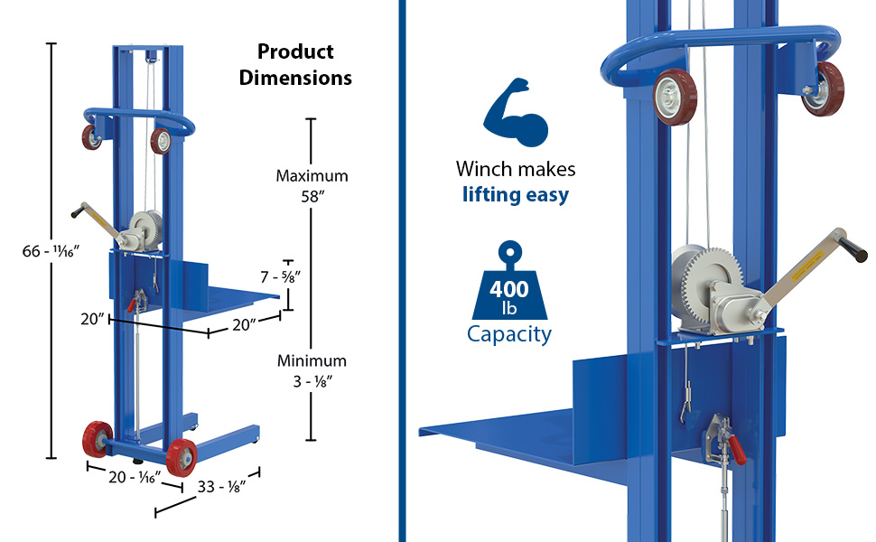 LLW-202058-FW LLW-202058-FWSteel Lite Load Lift With Winch and Fixed Wheels 20 In. x 20 In. Platform 400 Lb. Capacity BlueUniform Capacity (lb.): 400