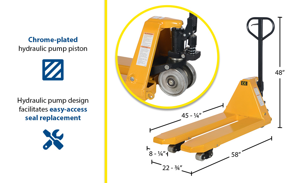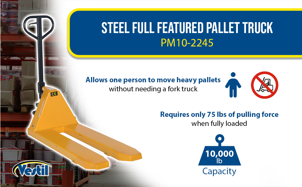 PM10-2245 PM10-2245Steel Full Featured Pallet Truck 58 In. x 22-3/4 In. x 48 In. 10000 Lb. Capacity YellowUniform Capacity (lb.): 10,000