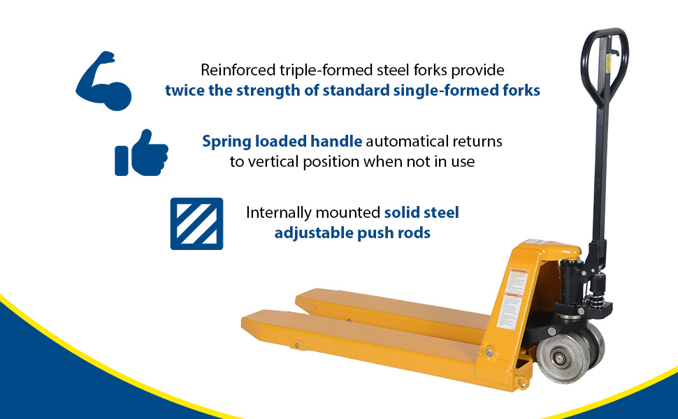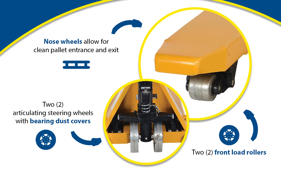 An economical way for one person to move heavy pallet loads without the use of a fork truck! Includes two articulating steering wheels and two front load rollers. Ergonomic design requires only 75 pounds of pulling force when fully loaded. Steering wheels include bearing dust covers for added life. Nose wheels are located on the front edge of each fork to assist in clean pallet entrance and exit. Wheels are constructed of Poly-on-Steel unless otherwise noted. Reinforced triple-formed steel forks provide twice the strength of standard single-formed forks. 7" wide forks are standard, except for model PM10-2245 which are 8-1/4" wide forks. Equipped with internally mounted solid steel adjustable push rods. Spring loaded handle automatically returns to vertical position when not in use. Hydraulic pump design facilitates easy-access seal replacement. Chrome-plated hydraulic pump piston for long seal life.