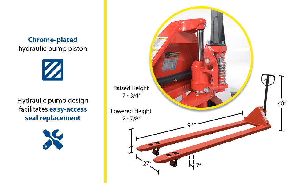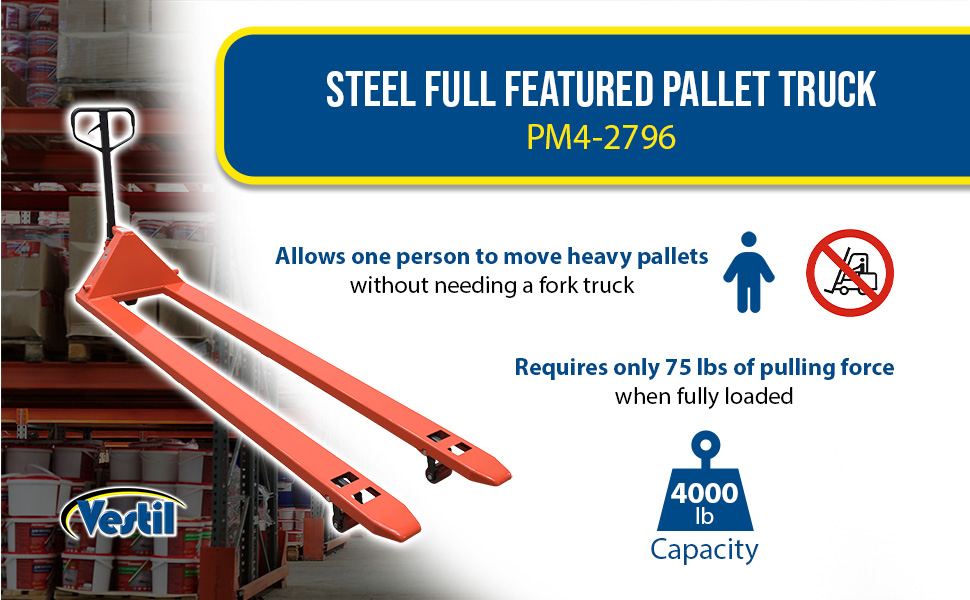PM4-2796 PM4-2796Steel Full Featured Pallet Truck 112 In. x 27 In. x 48 In. 4000 Lb. Capacity RedUniform Capacity (lb.): 4,000