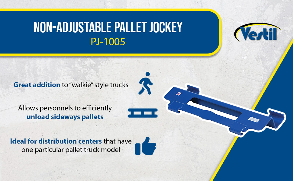 The Non-Adjustable (PJ-1005) unit is ideal for warehouse distribution centers that have one particular electric pallet truck model. To use, simply place the Pallet Jockey hooks into the fork wheel openings. Fits popular sizes of walkie trucks (verify your fork width and end of fork dimensions) and our electric pallet truck, model EPT-2547-30.