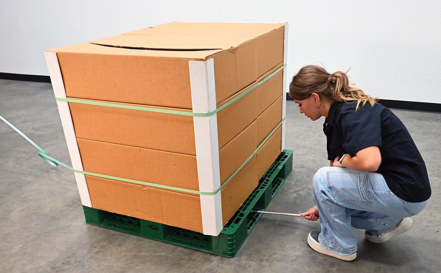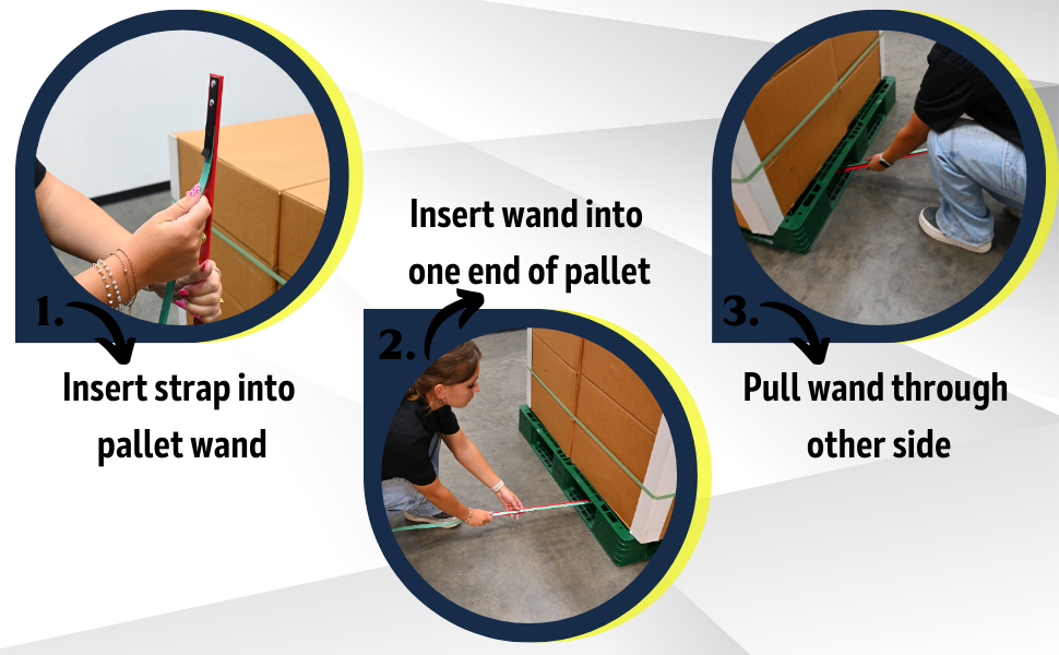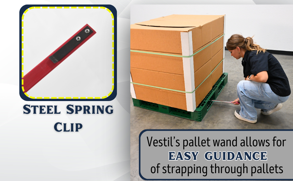 Allows for easy guidance of strapping through pallets. Decrease the time it takes to manually strap pallets. Flexible red fiberglass construction. Steel spring clip securely hold strapping.