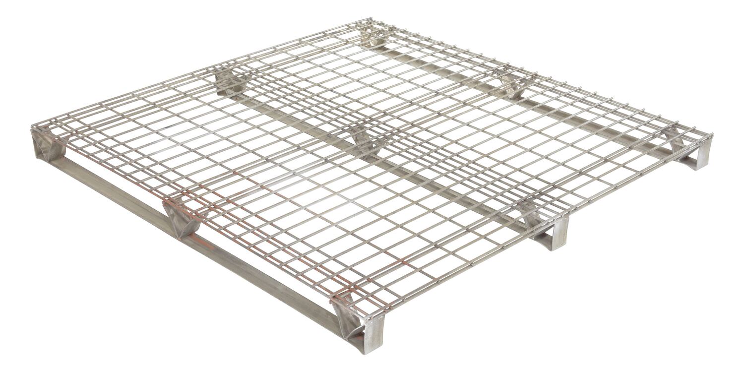 Galvanized Welded Wire Pallets will stand up to heavy-duty use. Design allows for stacking. Four-way access with pallet truck and fork trucks. Open decking features 2" x 4" grid pattern. Usable height on open end is 3". Usable eight on stringer end is 2-3/4". Understructure supports are made from 12 gauge steel. Decking is made from welded steel wire. Welded steel construction with galvanized finish.