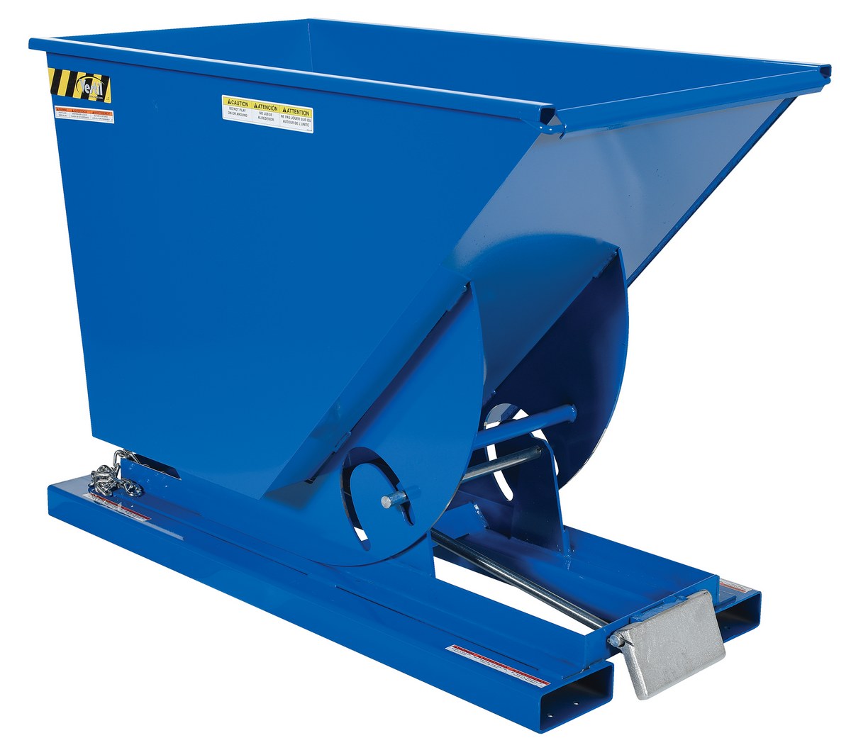 Hopper automatically dumps when bumper release contacts the front of the dumpster. Hopper returns to an upright and locked position automatically after it dumps. Also includes a cable that may be operated from the seat of the fork truck to manually dump the hopper. A safety restraint is provided to secure the hopper to the fork truck. Usable fork pockets are 7-1/2"W x 2-1/2"H. Self-dumping hoppers facilitate compliance with OSHA General Industry rule 29 CFR 1910.178(m)(5)(iii) by allowing lift truck operators to remain at the controls of their truck throughout the dumping process. Optional leak proof design sold separately. D-25, D-33, D-50, D-75, and D-100 are stackable if you stack the top hopper turned 90 degrees from the bottom. Blue baked-in powder-coated toughness is standard.