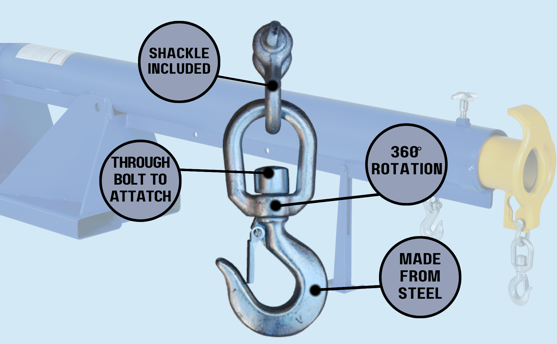 Easily connects to Hoisting Hooks, Hook Plates or Booms. Variety of capacities available. Forged steel construction. (HOOK-S series pictured above)