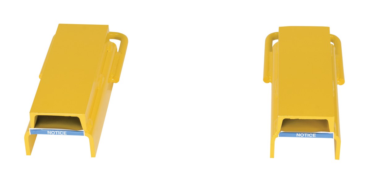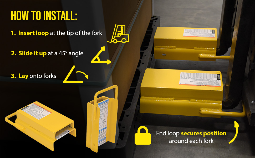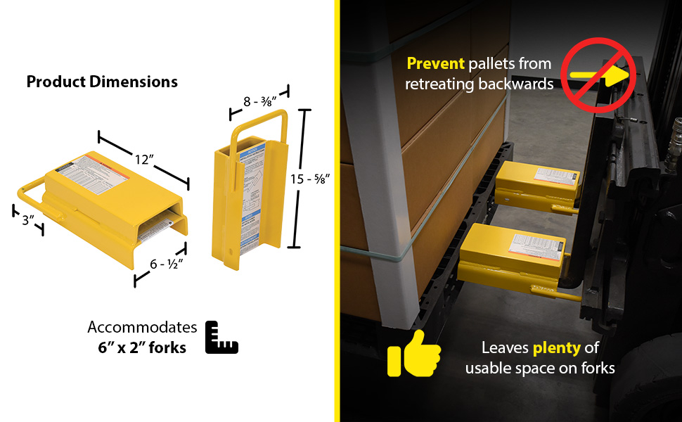 A rear spacer protects against possible damage to the fork truck, as well as products. Insert the loop at the tip of the fork and slide it up at a 45 degree angle. Then, lay it down over the existing forks. The attached end loop secures the spacer around each fork. Once in place, the spacers prevent pallets from retreating backwards onto the fork.