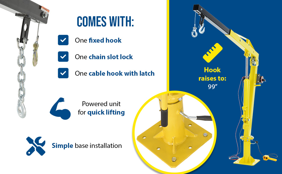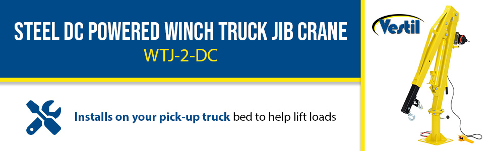 WTJ-2%20B.jpgInstalled in your pick-up truck bed, this winch operated jib crane will help lift loads. Lift items from ground to truck bed height, then rotate into cargo area. Includes telescopic boom design with manual hydraulic hand pump to pivot boom up and down. Cable usable length for all models is 24', except WTJ-2 (9' model WTJ-2). Unit comes with one fixed hook, one chain slot lock, and one cable hook with latch. The crane swivels on a 360 degree base. Safety yellow, galvanized or stainless steel finish available. Manual cable winch and 12V DC power cable winch styles available.