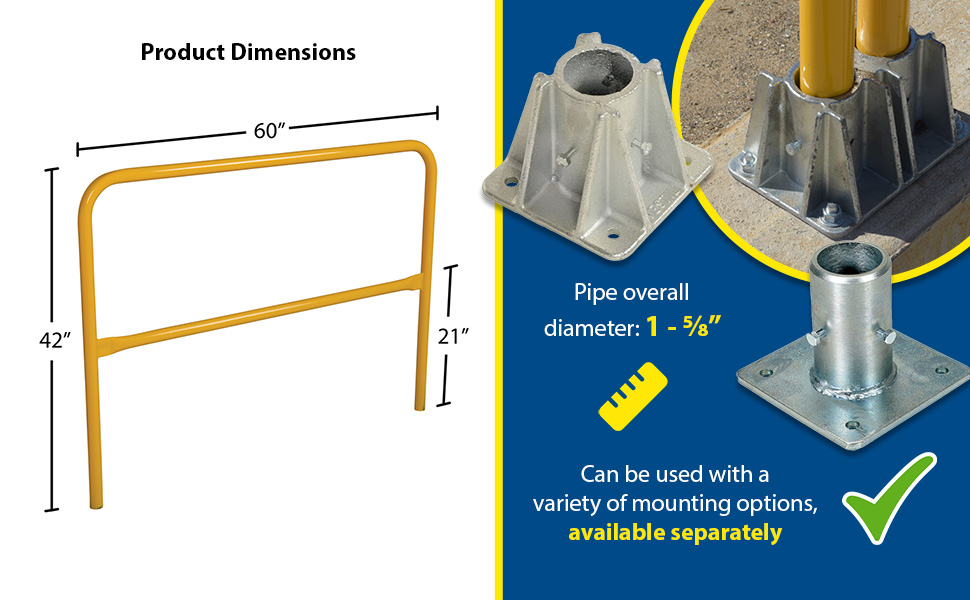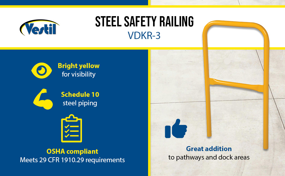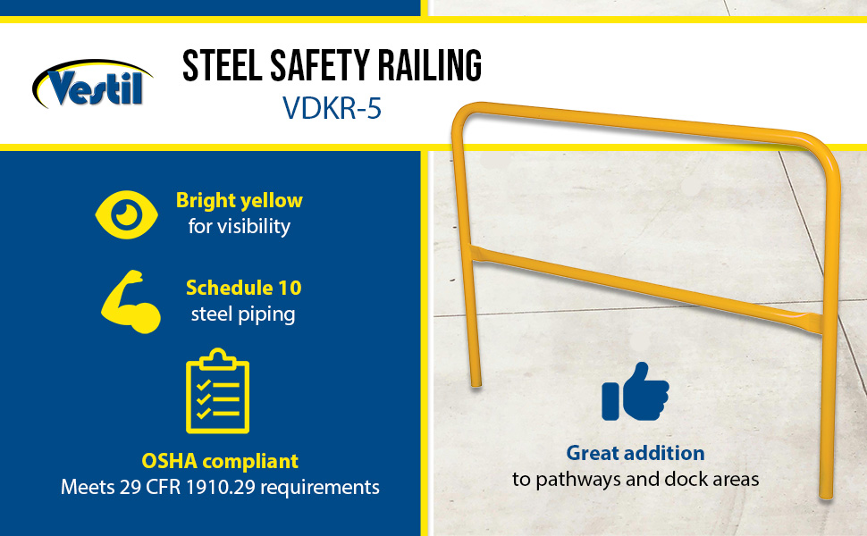 Protect people from uneven walkways and mezzanine drop-off's. The safety railing is constructed of schedule 10 steel. All models have an outside pipe diameter of 1-5/8". Handrails are 42" high with a 21" mid-rail. Mounting options include socket sleeves, cast steel base, barricade base, or cast steel sockets for convenient handrail removal. The cast steel sockets accept wood 2" x 4" or 2" x 6" when toe boards are required. Two (2) lag down holes are pre-drilled for permanently mounting the railing. The steel design includes a baked-in powder-coated finish, which is available in a variety of colors found in the table below. The VDKR series safety rail products comply with U.S. Occupational Safety and Health Administration (OSHA) General Industry requirements for guardrail systems in 29 CFR 1910.29.