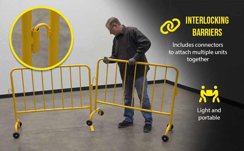 Attractive and functional design ideal for directing personnel. Interlocking portable railing has many commercial and industrial applications. Easy to move to meet changing needs. Upright bars are vertically spaced at 5-7/8" intervals for the light-weight barriers and 5-3/4" for the heavy-duty style. Each railing includes connectors to attach multiple units together to form long runs. Overall size is 102"L x 40"H. Feet are removable so railing will lay flat for shipping and storage. Variety of foot styles available. Rugged welded steel construction.