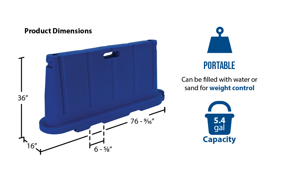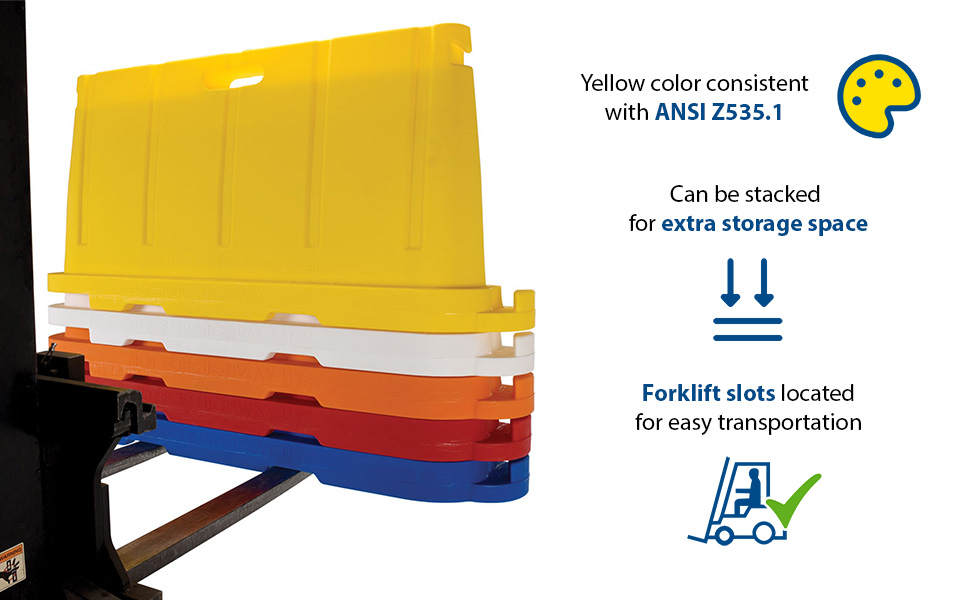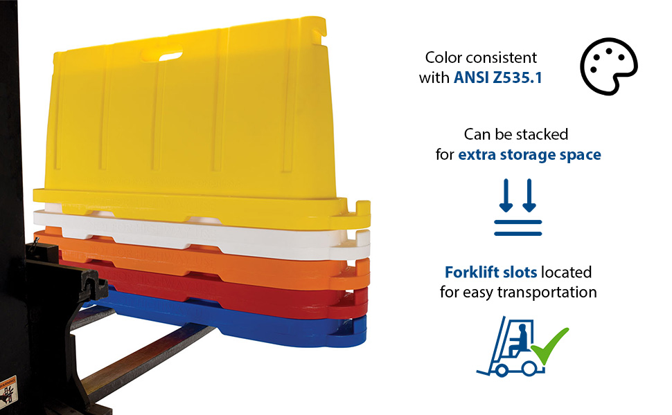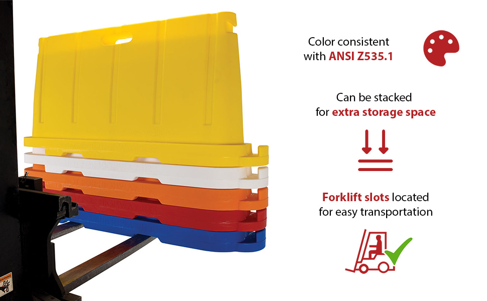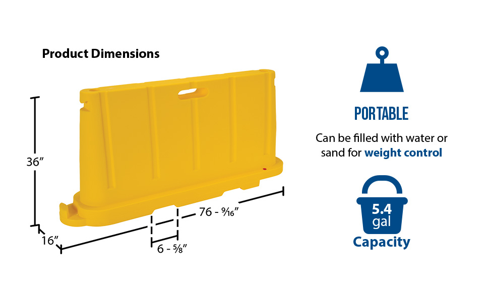 Uses 80% less storage space! Common uses include: Crowd & traffic control, area delineation, security, pedestrian protection, construction worker protection, restrict access to areas, factory & warehouse settings. Standard Features: Material thickness is 0.150" Empty weight is 37 Lb. Colors are consistent with ANSI Z535.1 safety colors Manufactured of virgin polyethylene material with UV stabilizer Overall size is 76-1/2"L X 16"W x 36"H (Effective connected length is 72") Hollow base may be filled with 5.4 gallons of water for added weight (~45 Lb.) Not for highway use.