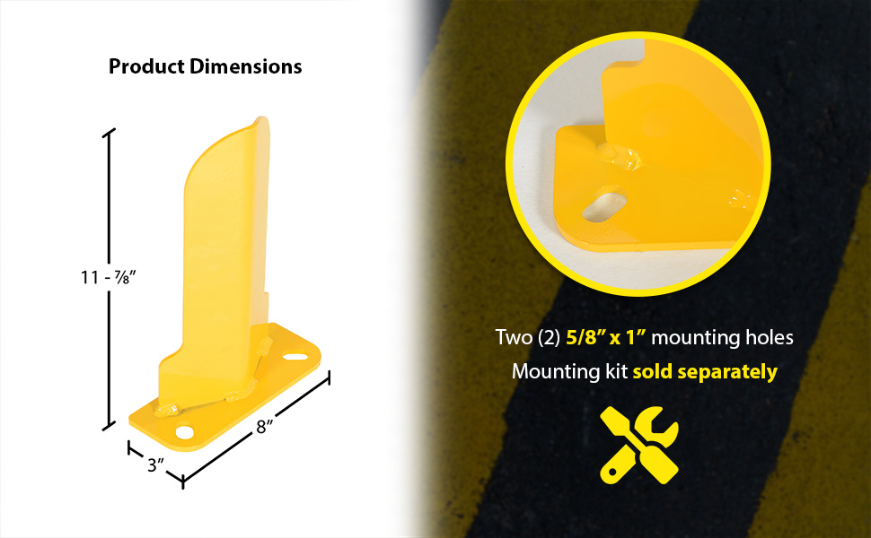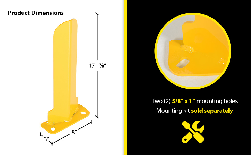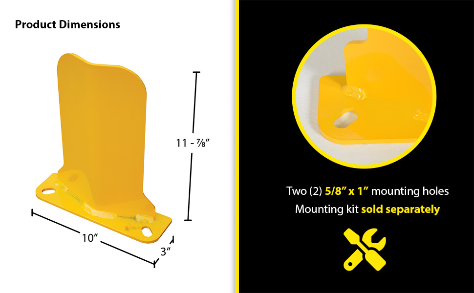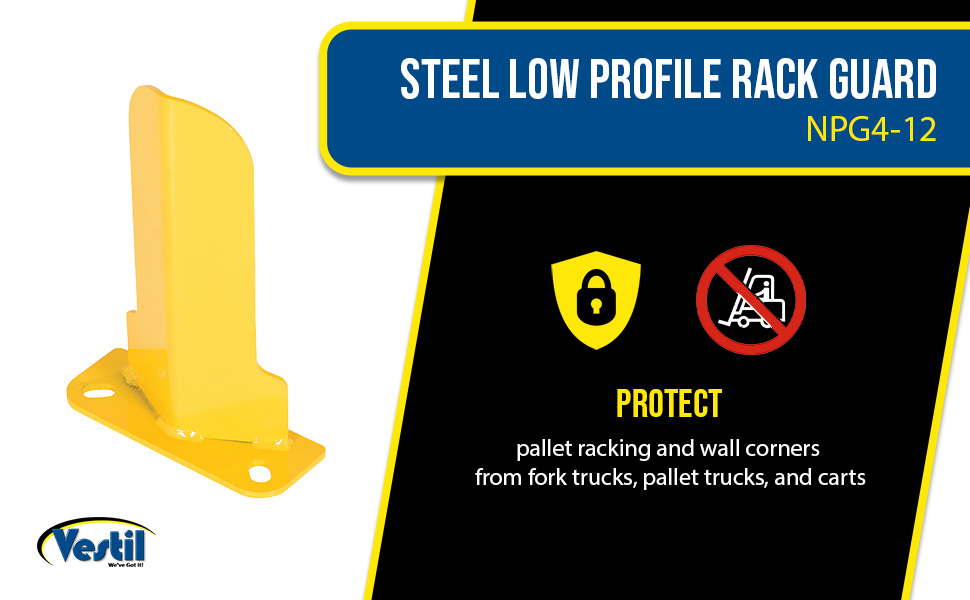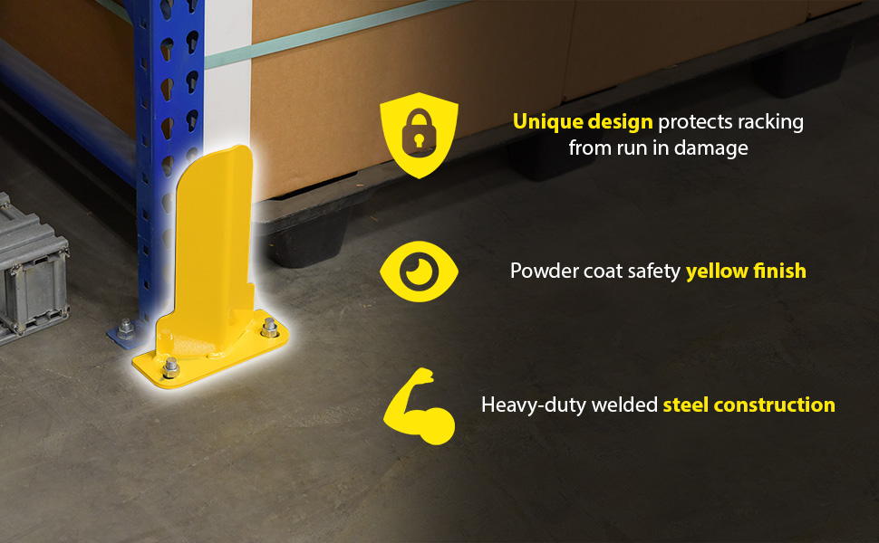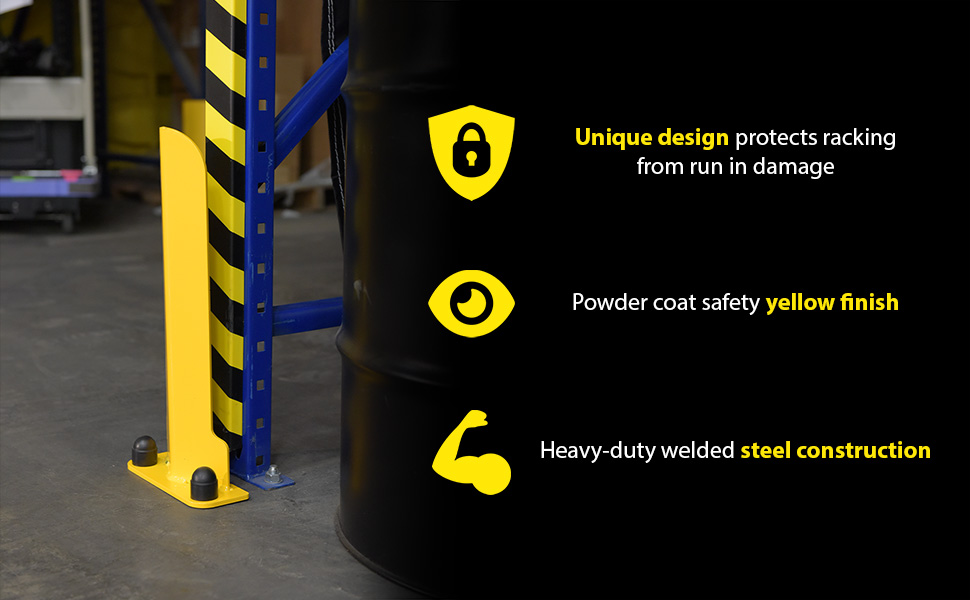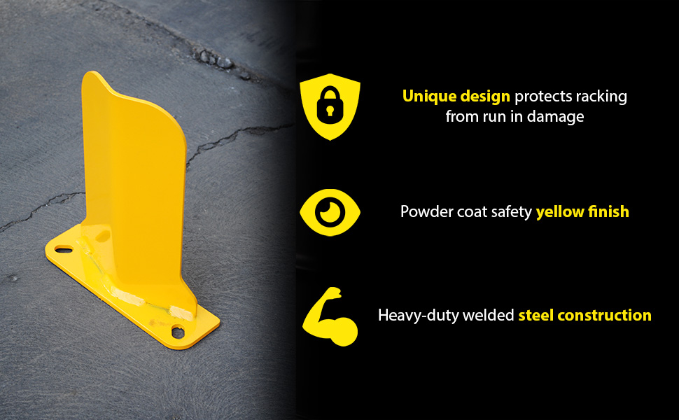 Protect pallet racking and wall corners against damage from fork trucks, pallet trucks and carts with Low Profile Rack Guards. All components are laser cut. Quick and easy two-hole installation. Installs in half the time of other guards. Safety yellow baked-in powder coat finish for added toughness. Steel construction. Installation hardware sold separately.