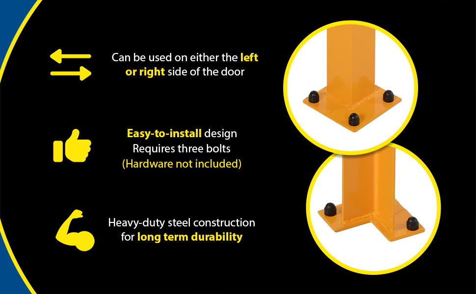Protect the tracks of overhead doors from fork trucks, pallet trucks, and other traffic with these solid steel constructed, economical Overhead Door Track Protectors. The base plate is 6" square with a 3" notch out and 9/16" diameter mounting holes. Safety yellow powder coat finish for long term wear. Steel construction.
