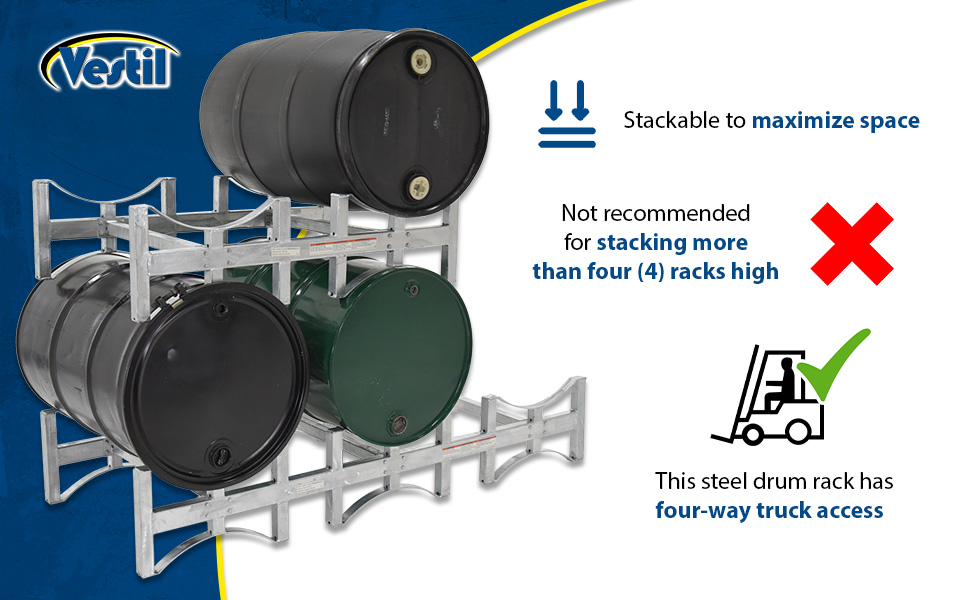 Steel Drum Racks accommodate 55 gallon drums and feature four-way fork truck access. Not recommended for stacking more than four (4) racks high. All steel construction with 1/4" formed steel cradles. Bolt together assembly with hardware included. Yellow painted finish. Models with suffix -SS are stainless steel. Models with suffix -G are galvanized. Drums, drum racks, and drum carts all sold separately.