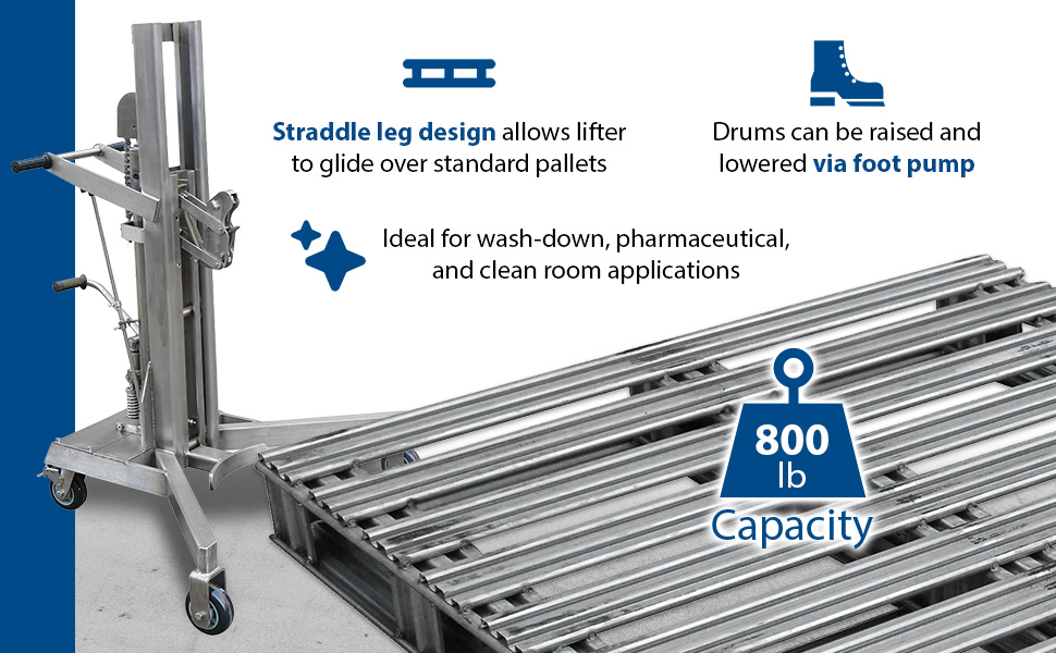 The Stainless steel hydraulic drum lifter is designed to allow the operator to load or unload drums on and off the corner of pallets. Straddle leg design allows the drum lifter to glide over standard pallets and grab most 30, 55, or 85 gallon steel and poly drums. Drums are raised and lowered easily using the foot pump. 304 grade all stainless steel construction. Ideal for washdown, pharmaceutical, and clean room applications. Highly maneuverable on two (2) rigid and two (2) swivel with brake nylon wheels. Cannot be used with fiber drums.