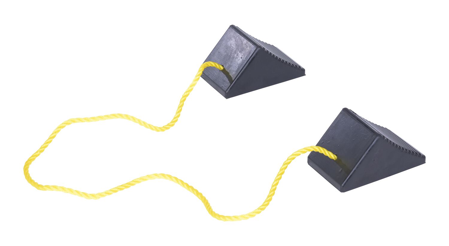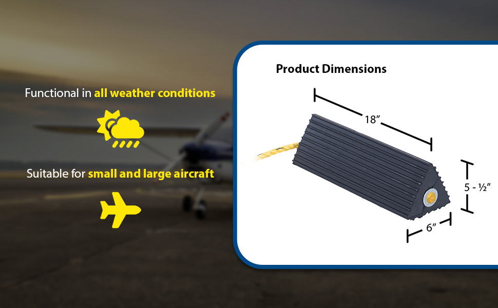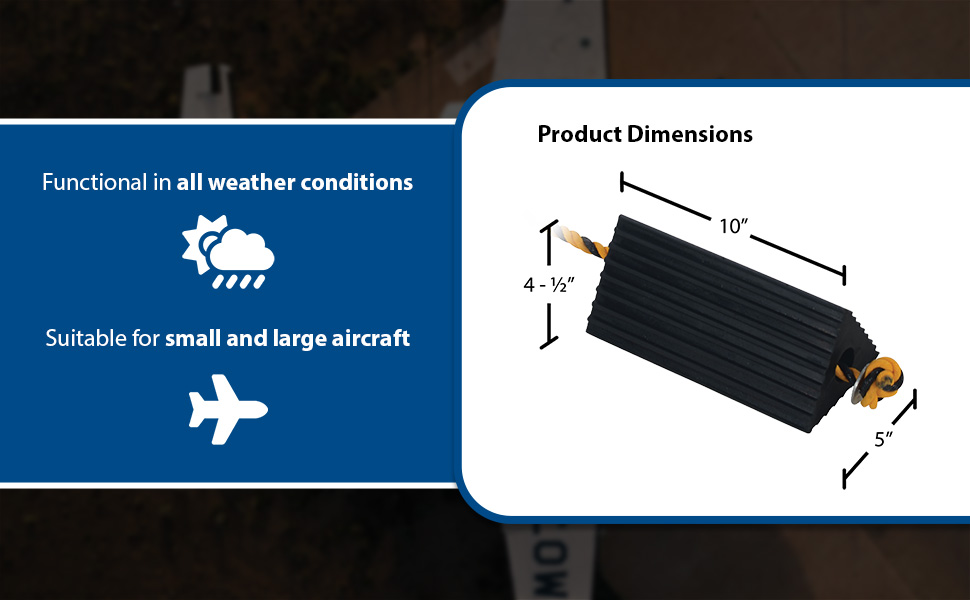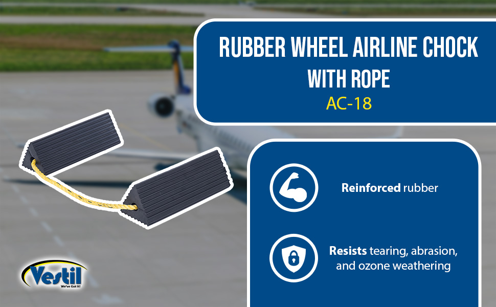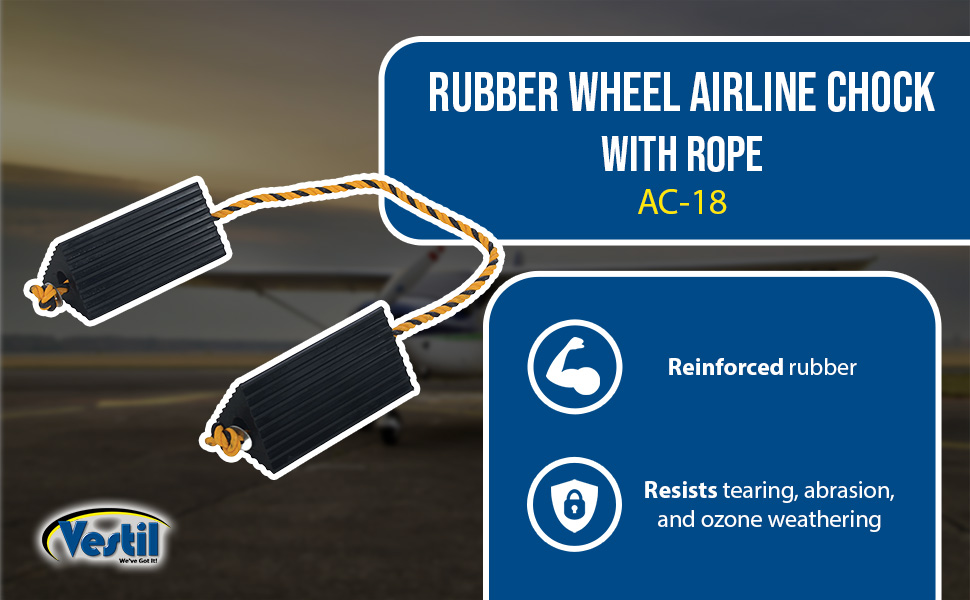 Constructed of reinforced rubber to provide a sure grip on virtually any surface. Curved surface contours to fit tires. Rubber resists tearing, abrasion, ozone weathering, etc. Functional design is durable in all weather conditions. Series RWC-8 is constructed of a mix of virgin and recycled, no reinforcement cords. Airline Chocks (AC series) are suitable for small and large aircraft. Model AC-13 Includes a 36" polypropylene rope while AC-18 has a 24" long polypropylene rope between the chocks.