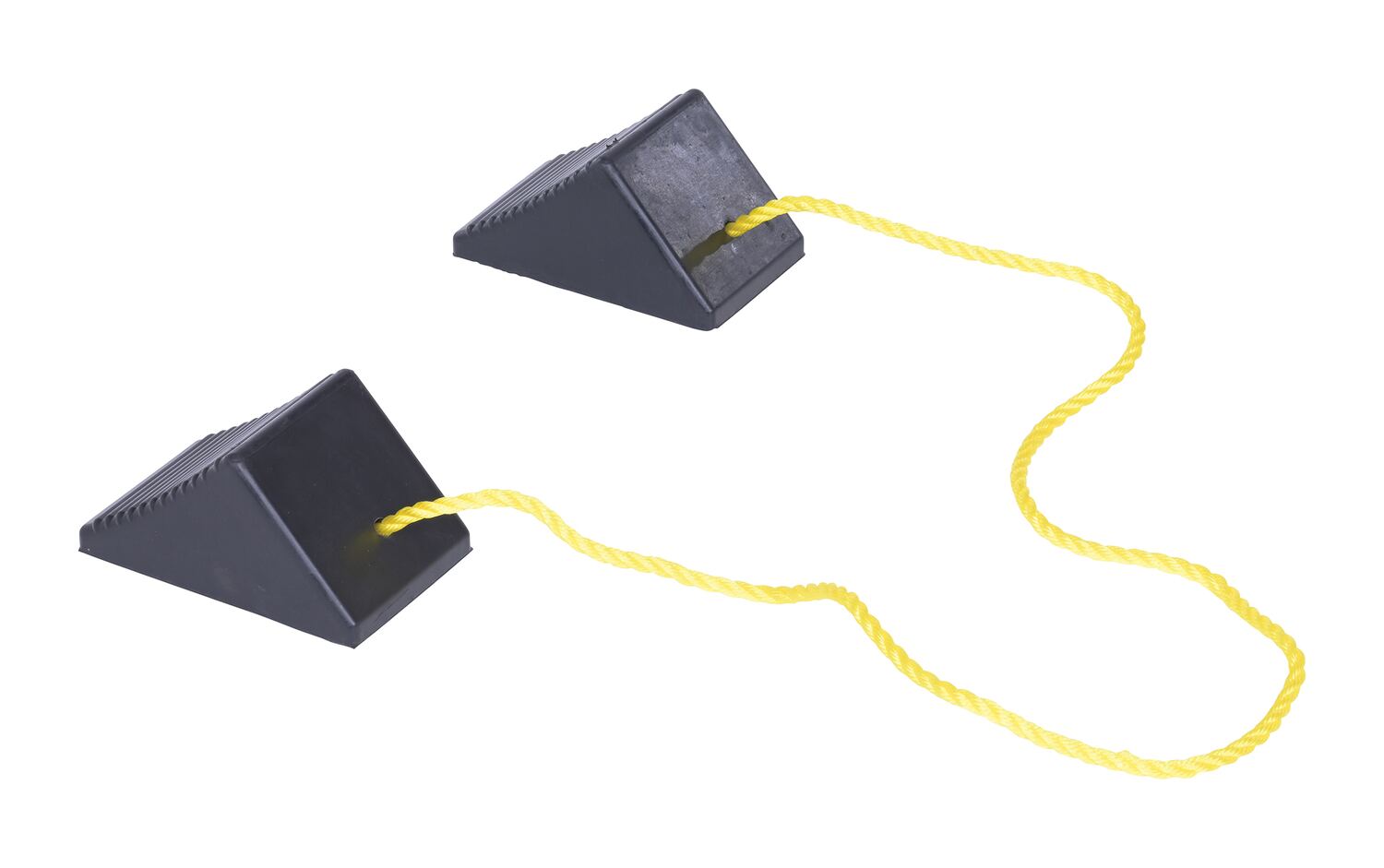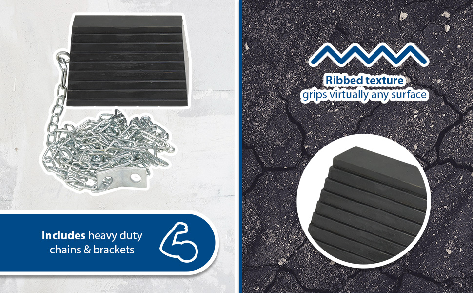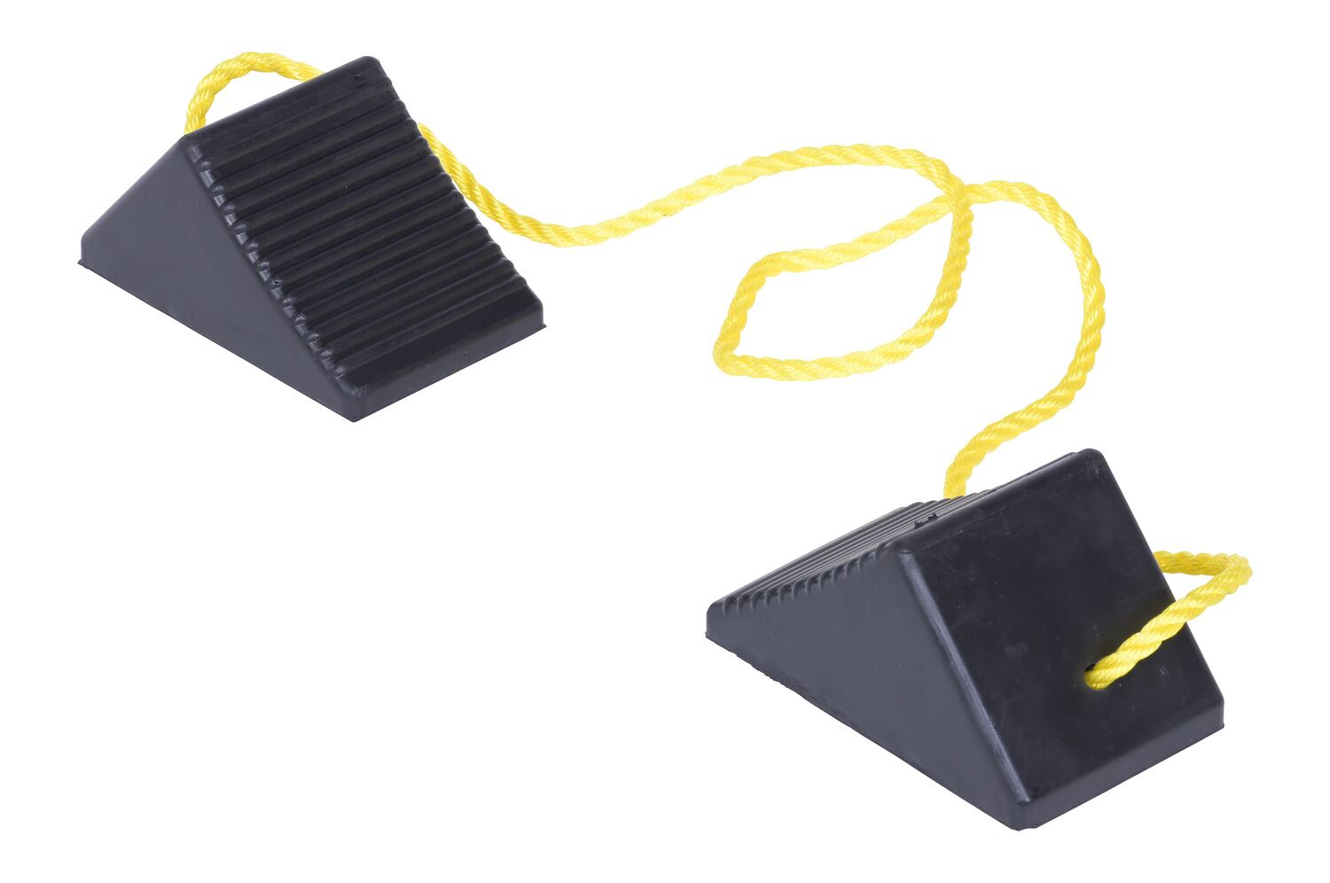 Constructed of reinforced rubber to provide a sure grip on virtually any surface. Curved surface contours to fit tires. Rubber resists tearing, abrasion, ozone weathering, etc. Functional design is durable in all weather conditions. Series RWC-8 is constructed of a mix of virgin and recycled, no reinforcement cords. Airline Chocks (AC series) are suitable for small and large aircraft. Model AC-13 Includes a 36" polypropylene rope while AC-18 has a 24" long polypropylene rope between the chocks.