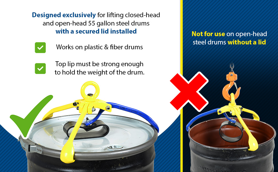 Designed exclusively for lifting closed and open-head 55 gallon steel drums with a secured lid installed. Not for use on open-head drums without a lid. This product works on select 55 gallon plastic and fiber drums with a top lip strong enough to hold the weight of the drum. Designed for quick and easy one person operation, with drum in a vertical position. The narrow profile design is great for picking up drums packed close together. The three-arm ductile-iron design offers maximum strength and simplicity allowing the centering of the drum under the lifter. The polyurethane "spring" loop keeps the lifter securely engaged to the drum, which is especially beneficial when using the lifter in a rough environment including swinging, bouncing, and incidental collisions. Unit must be manually disengaged from the drum when finished with use.