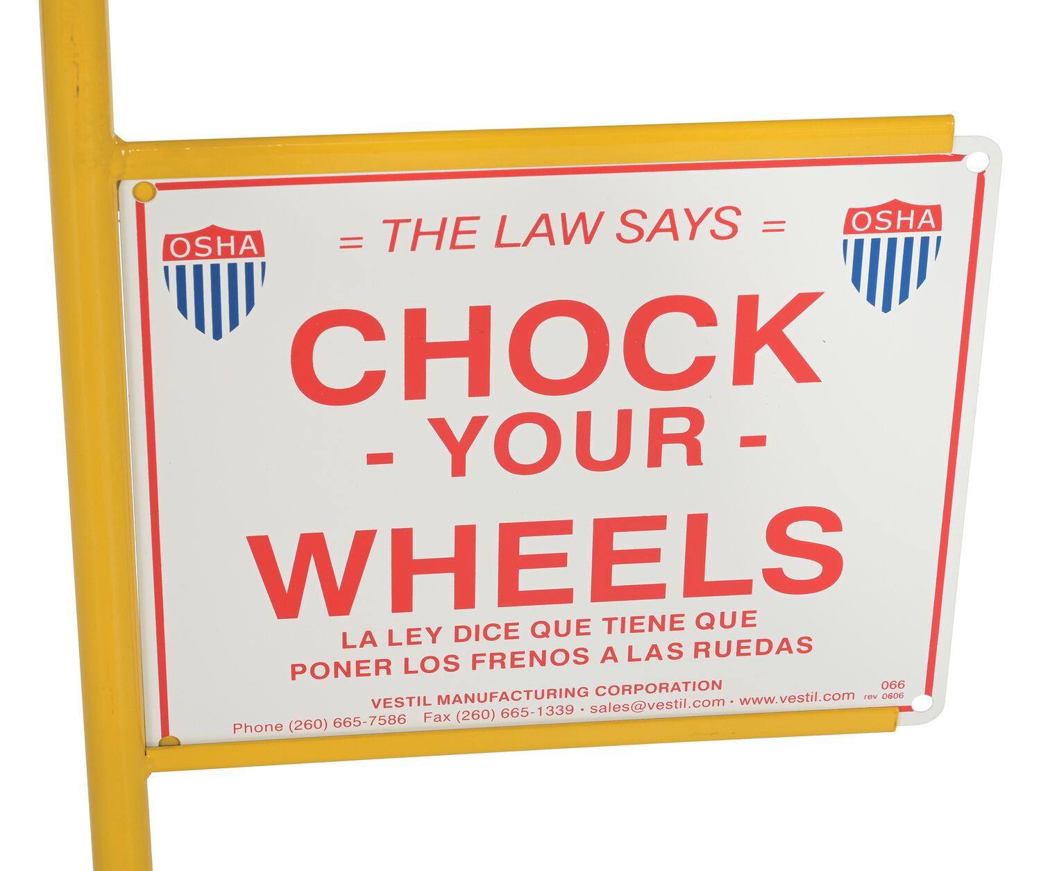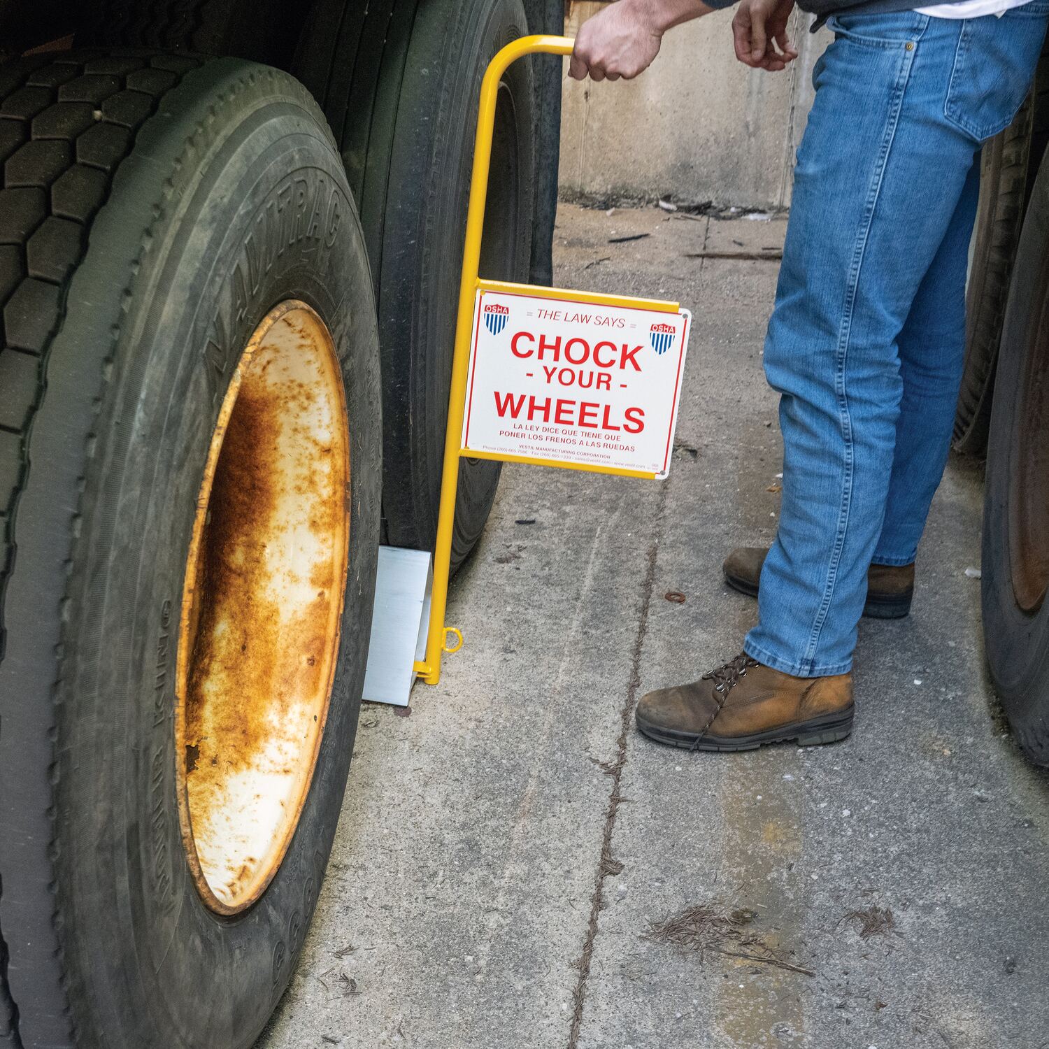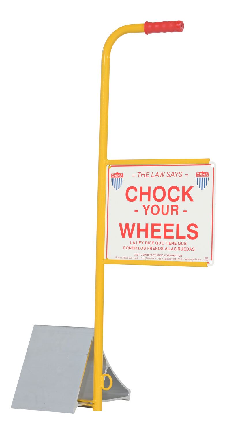 Constructed of extruded lightweight aluminum that is easy to handle. Features a serrated top to grip the tire and a triple edged bottom to grip the ground. Optional handle and sign attachment available. Customer signs available.
