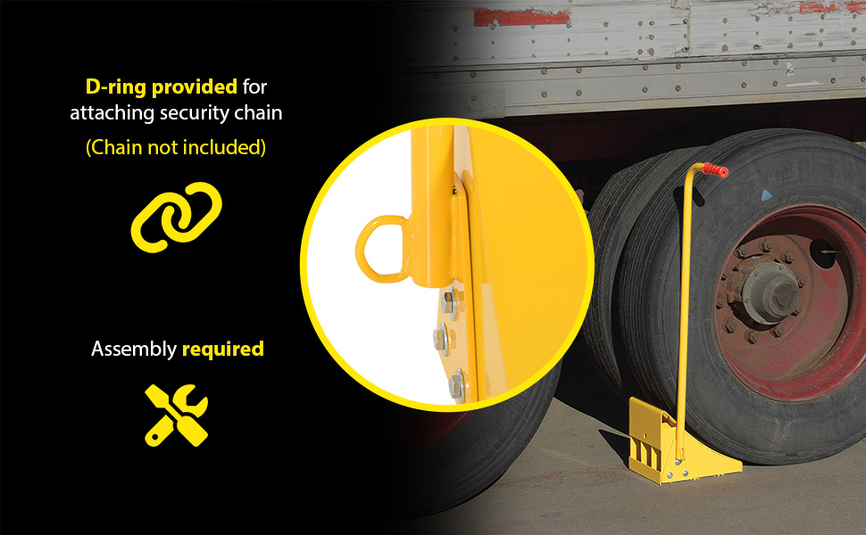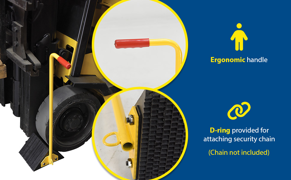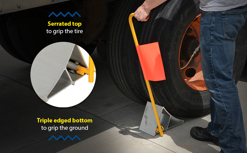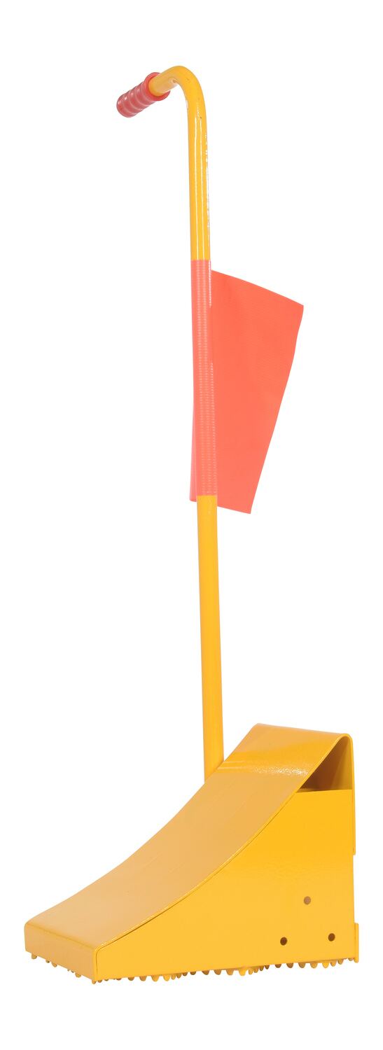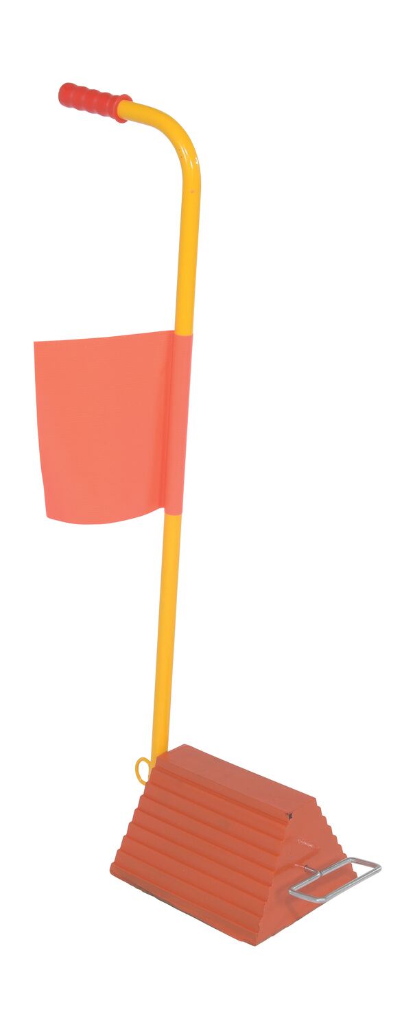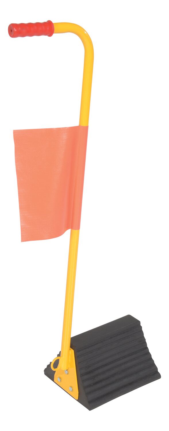 Ergonomically designed to make it easy to move wheel chocks in and out of position under trailer wheels. Reduce the risk of back, knee, and foot injuries. Handle is constructed of steel and includes a yellow baked-in powder-coated toughness. D-Ring provided for attaching security chain (chain not included.) Assembly required. High Visibility Flag |